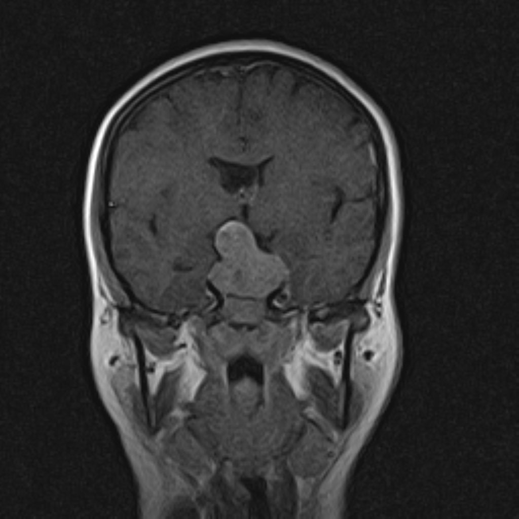 – A large extra axial – iso signal mass lesion ( 20 x 36 x 48 mm ) in pituitary fossa with extention to supra sella cistern & mass effect in chiasma optic with partial encasement of right & left ICA with pituitary expansion & with post contrast homogeneous enhancement suggestive for pituitary macro adenoma (  snow man disease )