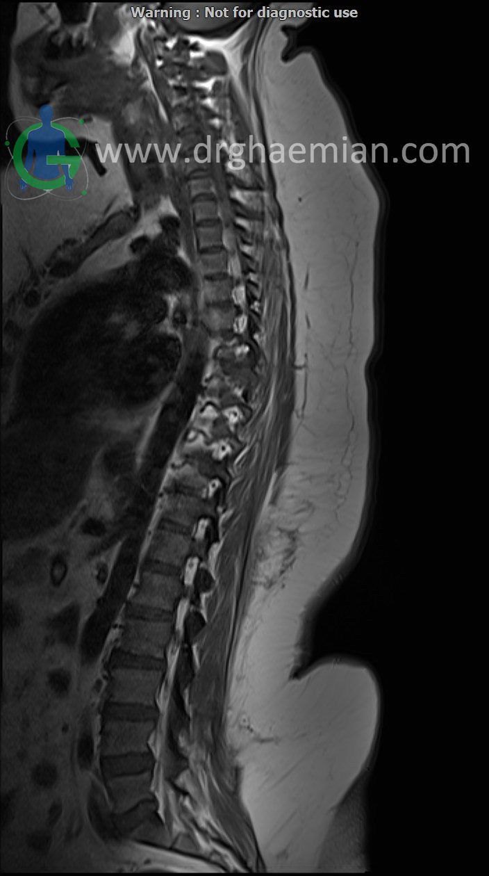 The thoracic spine shows a smooth kyphotic curvature with normal alignment. The vertebral bodies and endplates are normal in shape and signal intensity. The intervertebral disk spaces are normal height . The bony spinal canal has normal width. The imaged soft tissues show no abnormalities . Paravertebral stripe is normal in shape and signal intensity .