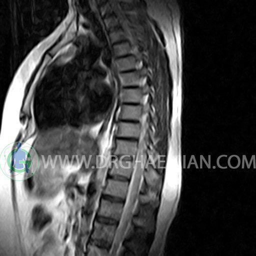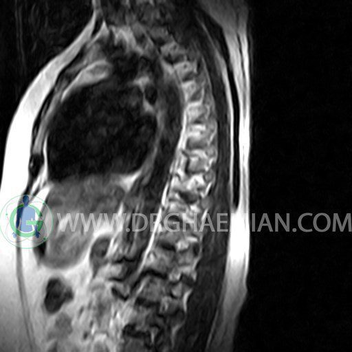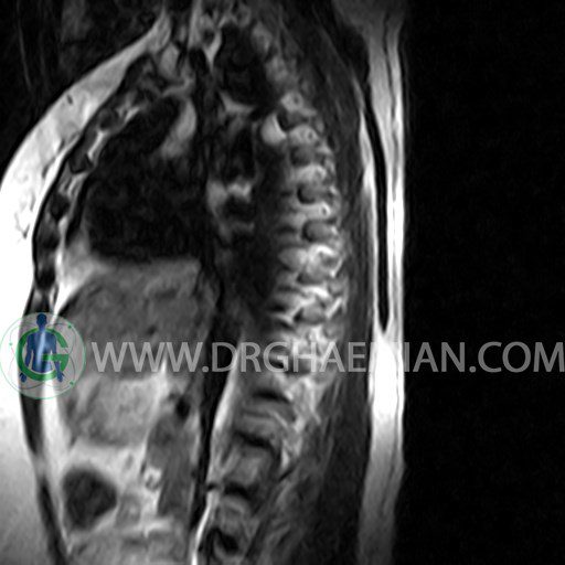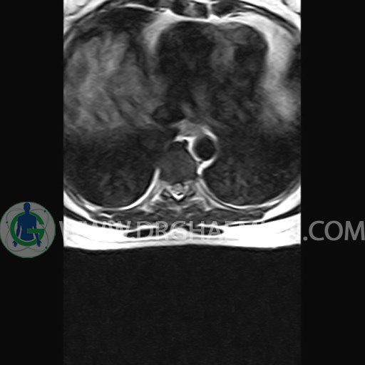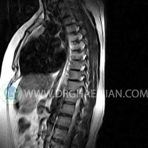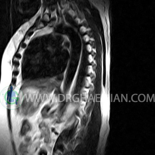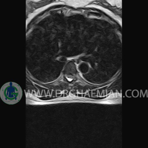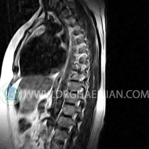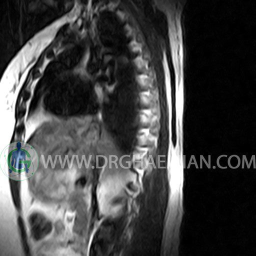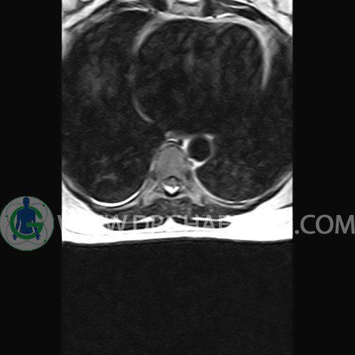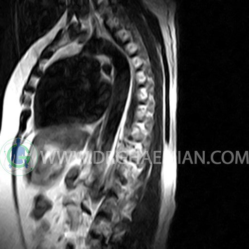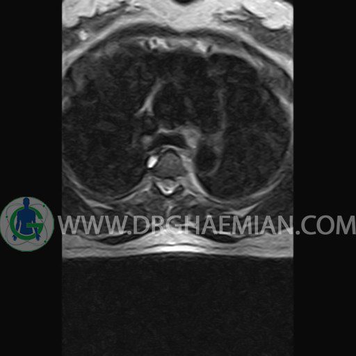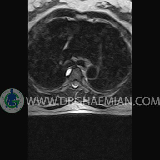 سی تی اسکن توراسیک یک روش تصویربرداری است که با استفاده از تشعشعات تصاویر عرضی مقطعی از ناحیه توراسیک ستون فقرات و بالا تنه ایجاد می کند. در این کیس ضایعه کیستیک پاراورتبرال، اسپوندیلوز، باریک شدن فضای دیسک، دیهیدراته و بیرون زدگی میان توراسیک دیده می شود.