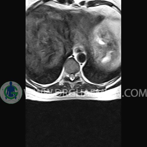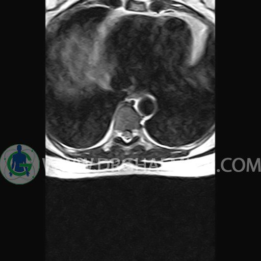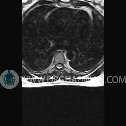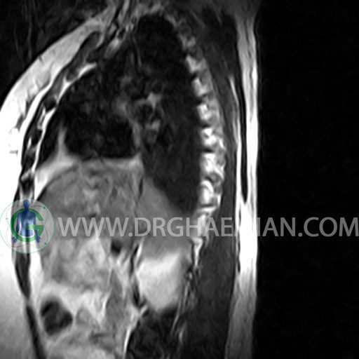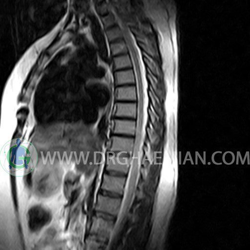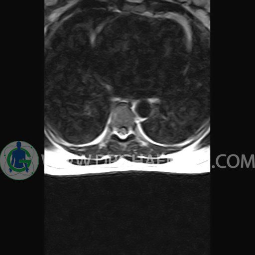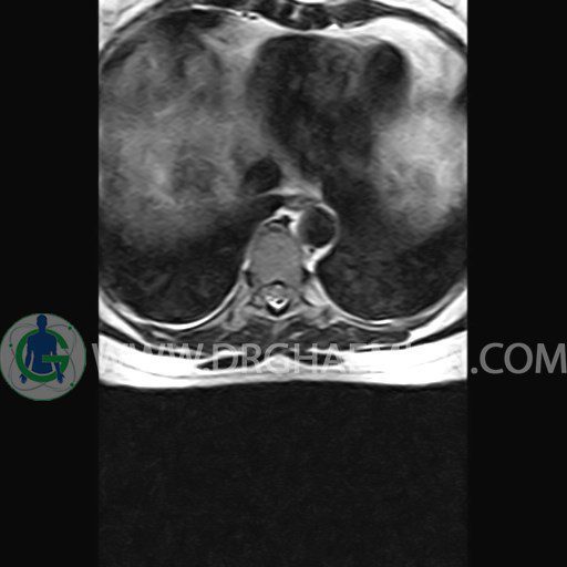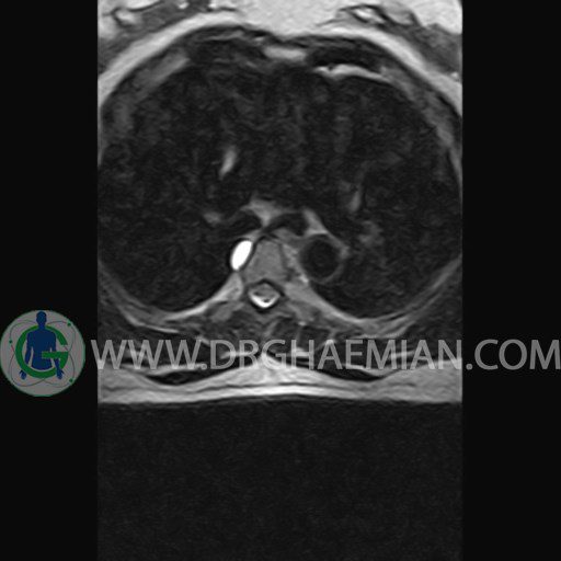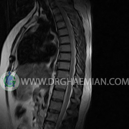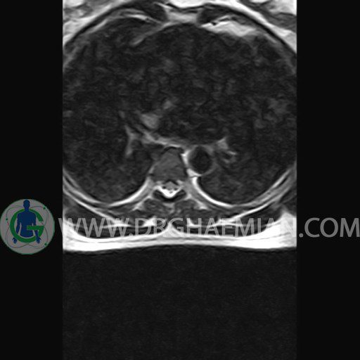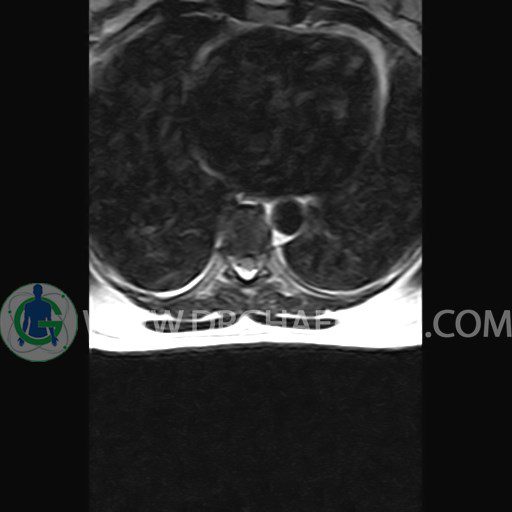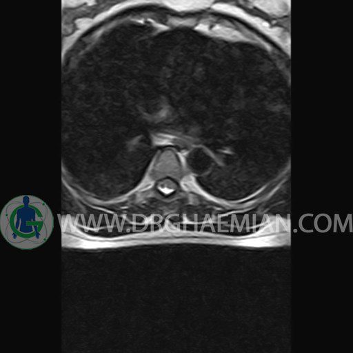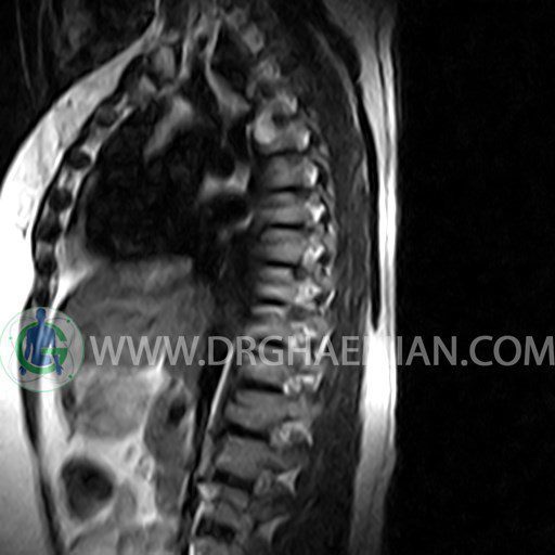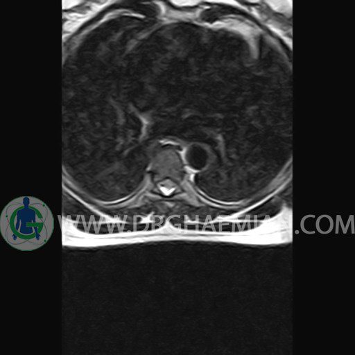 سی تی اسکن توراسیک یک روش تصویربرداری است که با استفاده از تشعشعات تصاویر عرضی مقطعی از ناحیه توراسیک ستون فقرات و بالا تنه ایجاد می کند. در این کیس ضایعه کیستیک پاراورتبرال، اسپوندیلوز، باریک شدن فضای دیسک، دیهیدراته و بیرون زدگی میان توراسیک دیده می شود.