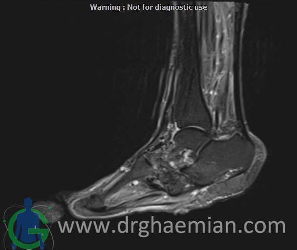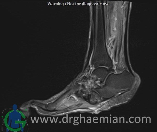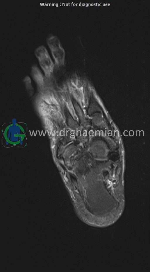 ام آر آی کف پا و انگشتان یک روش تصویربرداری پزشکی است که با استفاده از میدان‌های مغناطیسی قوی و امواج رادیویی تصاویر دقیق و باکیفیتی از ساختارهای داخلی کف پا و انگشتان ایجاد می‌کند. این روش بدون استفاده از اشعه‌های مضر مانند اشعه ایکس انجام می‌شود و به پزشک کمک می‌کند تا با جزئیات بیشتری آسیب‌ها، التهاب‌ها یا مشکلات دیگر را تشخیص دهد.در ان کیس یک پای بیمار مبتلا بهب بیماری دیابت دیده میشود.