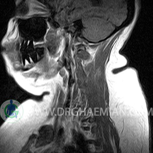 ام آر آی گردن با استفاده از انرژی آهنرباهایی قوی نصاویری از قسمت ستون فقرات که از گردن (ناحیه گردن ستون فقرات) عبور می کند، ایجاد می کند. ام آر آی از تشعشعات استفاده نمی کند. در این کیس کیفوز گردن و دیهیدراته و بیرون زدگی مهره های C3/C4/C5/C6/C7 دیده می شود.