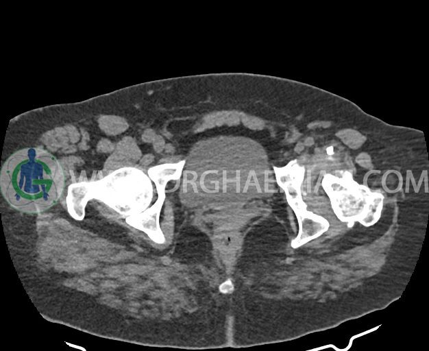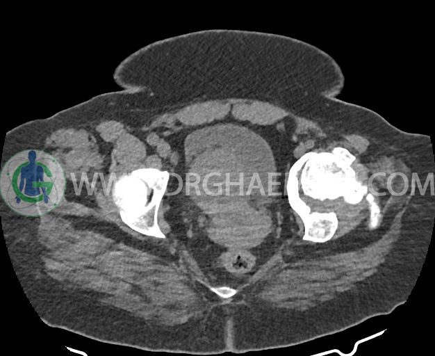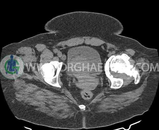 سی تی اسکن شکم و لگن با استفاده از اشعات ایکس تصاویر عرضی از ناحیه شکم و لگن ایجاد میکند. در این کیس استئوآرتریت لگن چپ، چندین سنگ در کلیه راست و اسپوندیلولیز مهره L5 دیده می شود.