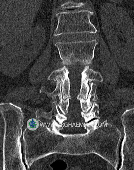 سی تی اسکن ستون فقرات پایینی تصاویری عرضی از ناحیه پایین ستون فقرات ایجاد می کند. این تصویربرداری از تششعات برای ایجاد تصاویر استفاده می کند. در این کیس آنترولیستزیس کمر در L3/L4 و L4/L5 به هماره تغییرات DJD، هیپرلوردوز کمری، رترولیستیس در L2/L3 به همراه تغییراتی DJD، لامینکتومی مهره ای L3 و L4 مشاهده می شود.