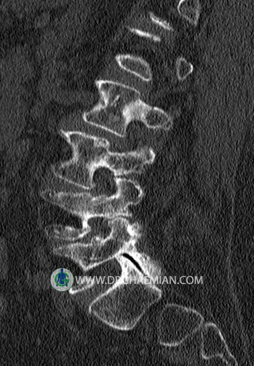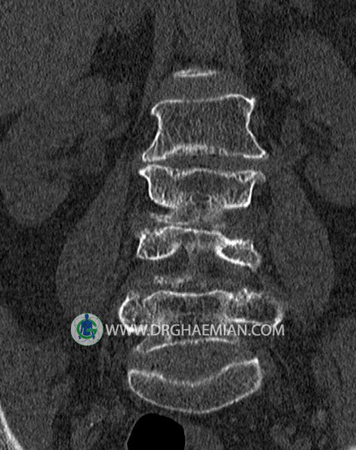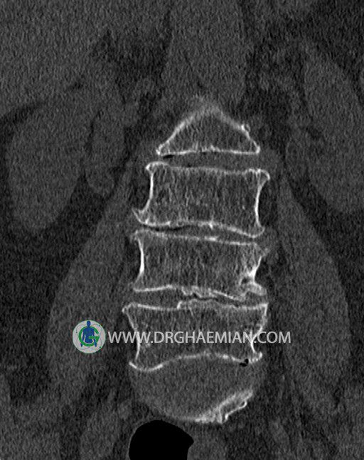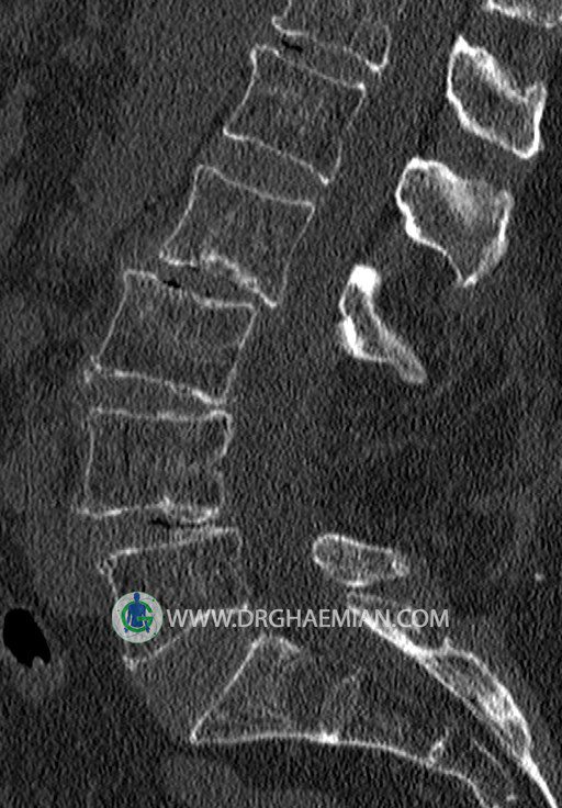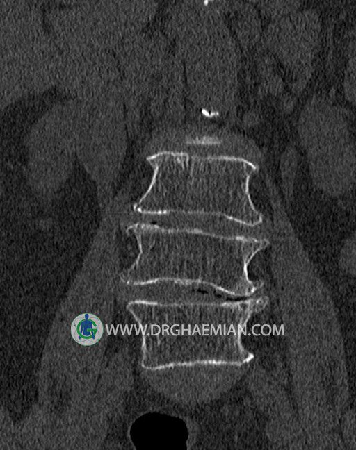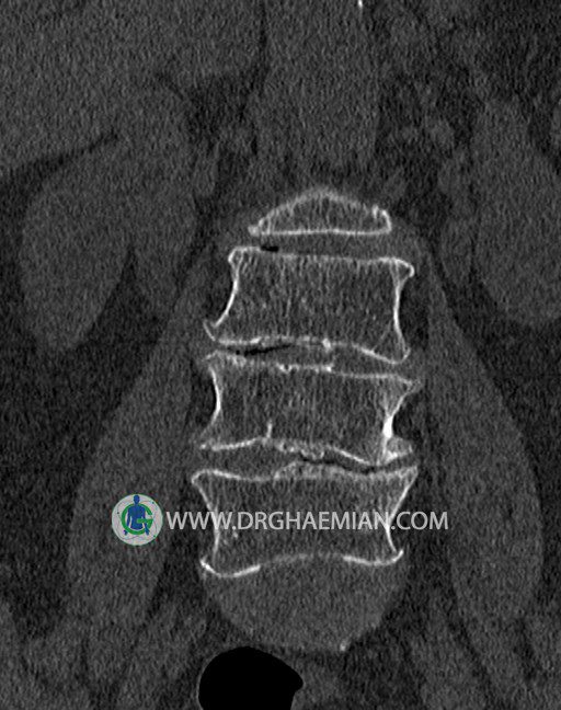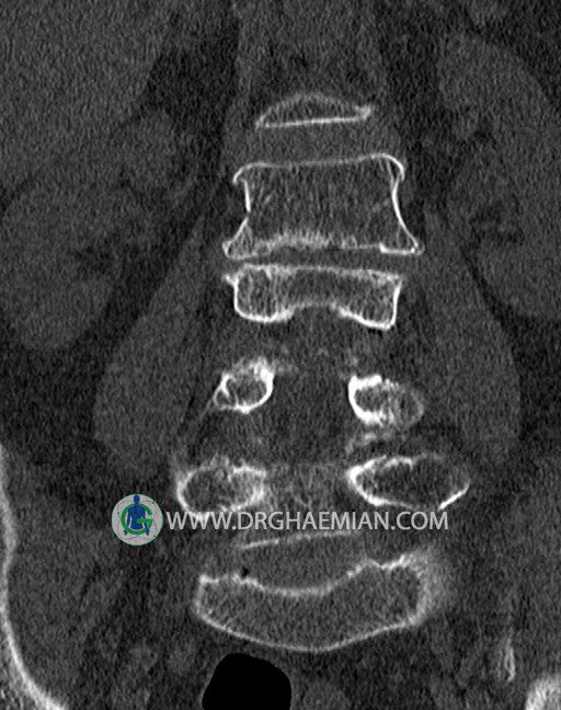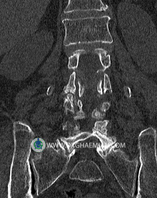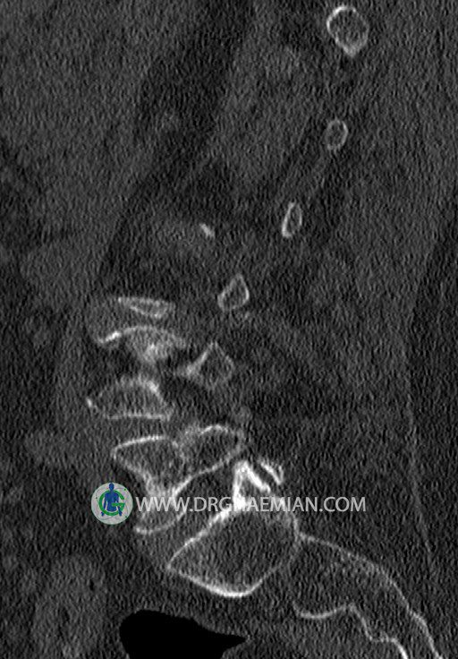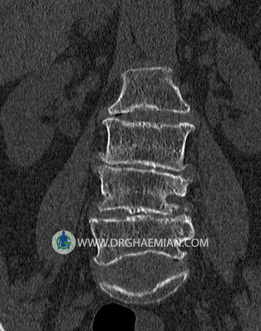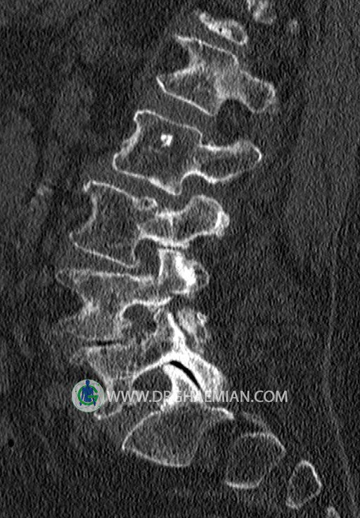 سی تی اسکن اسپيرال از قسمت تحتاني T12 تا انتهاي S3 (مولتي ديدکتور 16 بامقاطع ظريف و بازسازي هاي ساژيتال و کرونال و 3D):