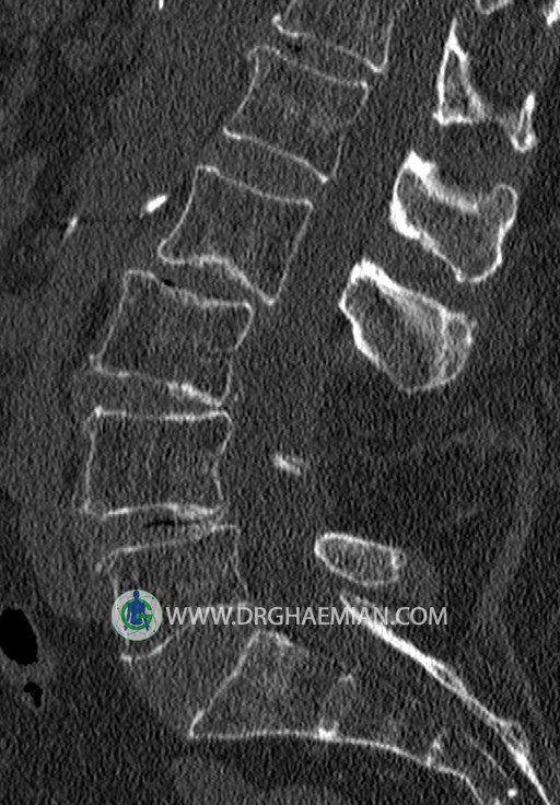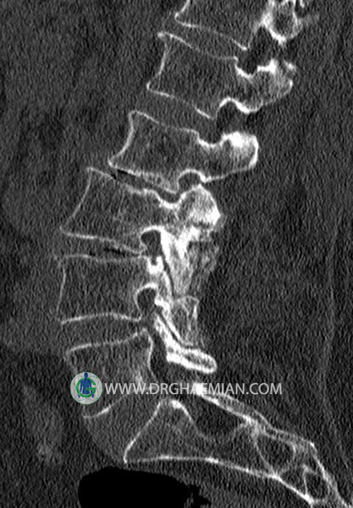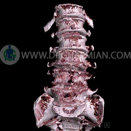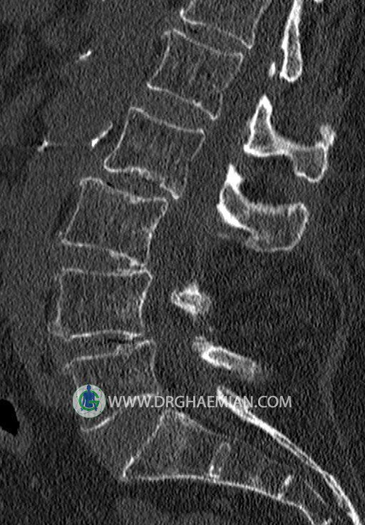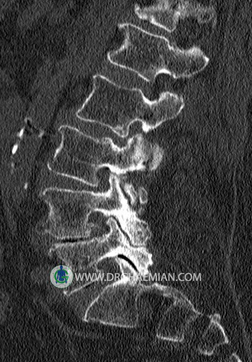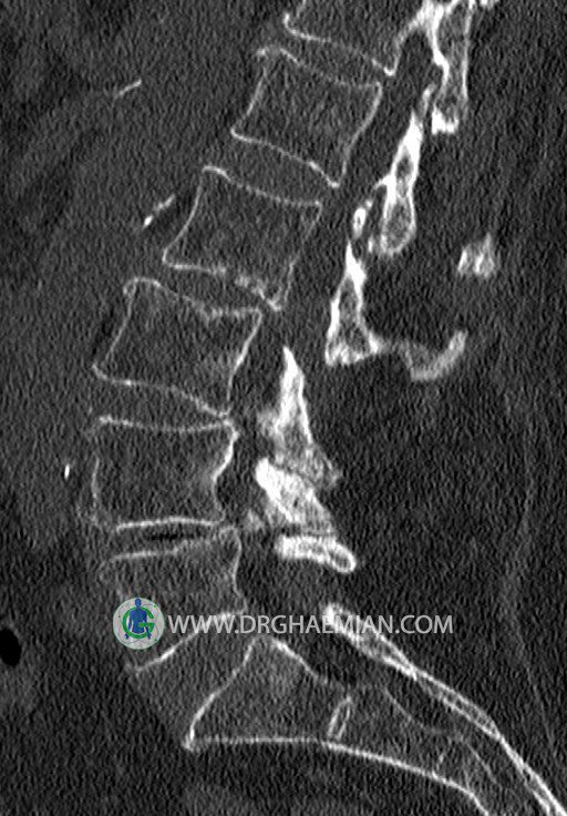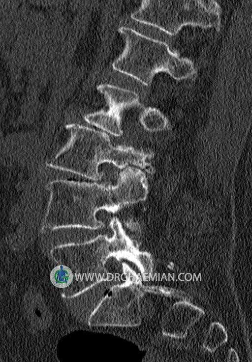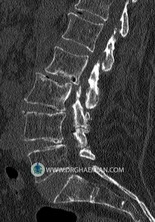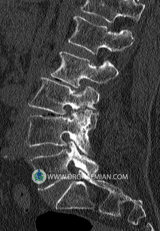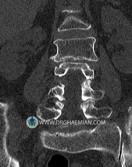 سی تی اسکن اسپيرال از قسمت تحتاني T12 تا انتهاي S3 (مولتي ديدکتور 16 بامقاطع ظريف و بازسازي هاي ساژيتال و کرونال و 3D):