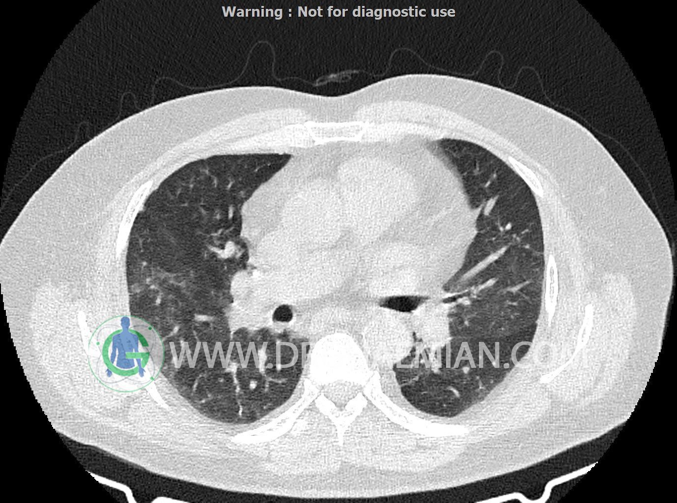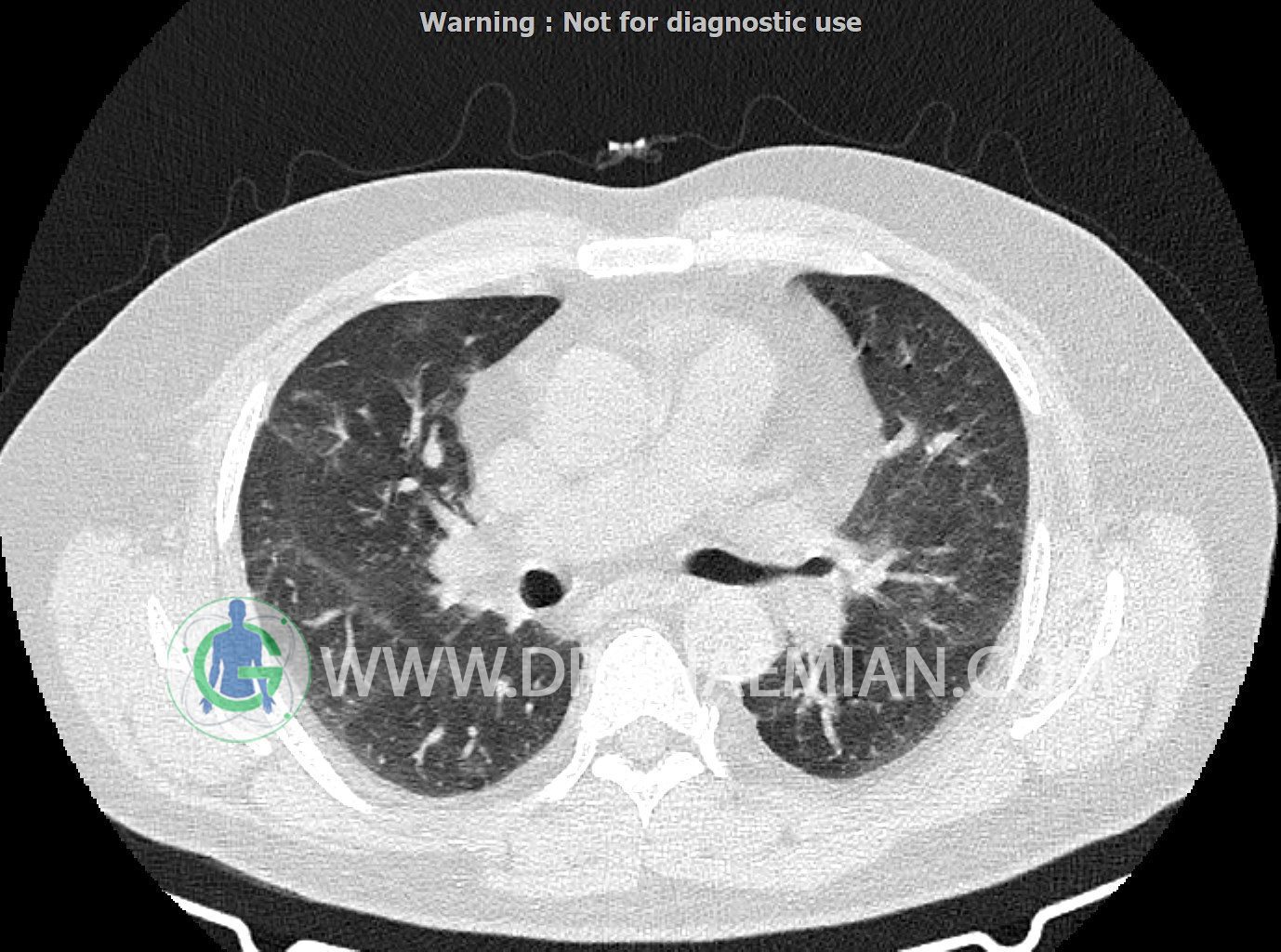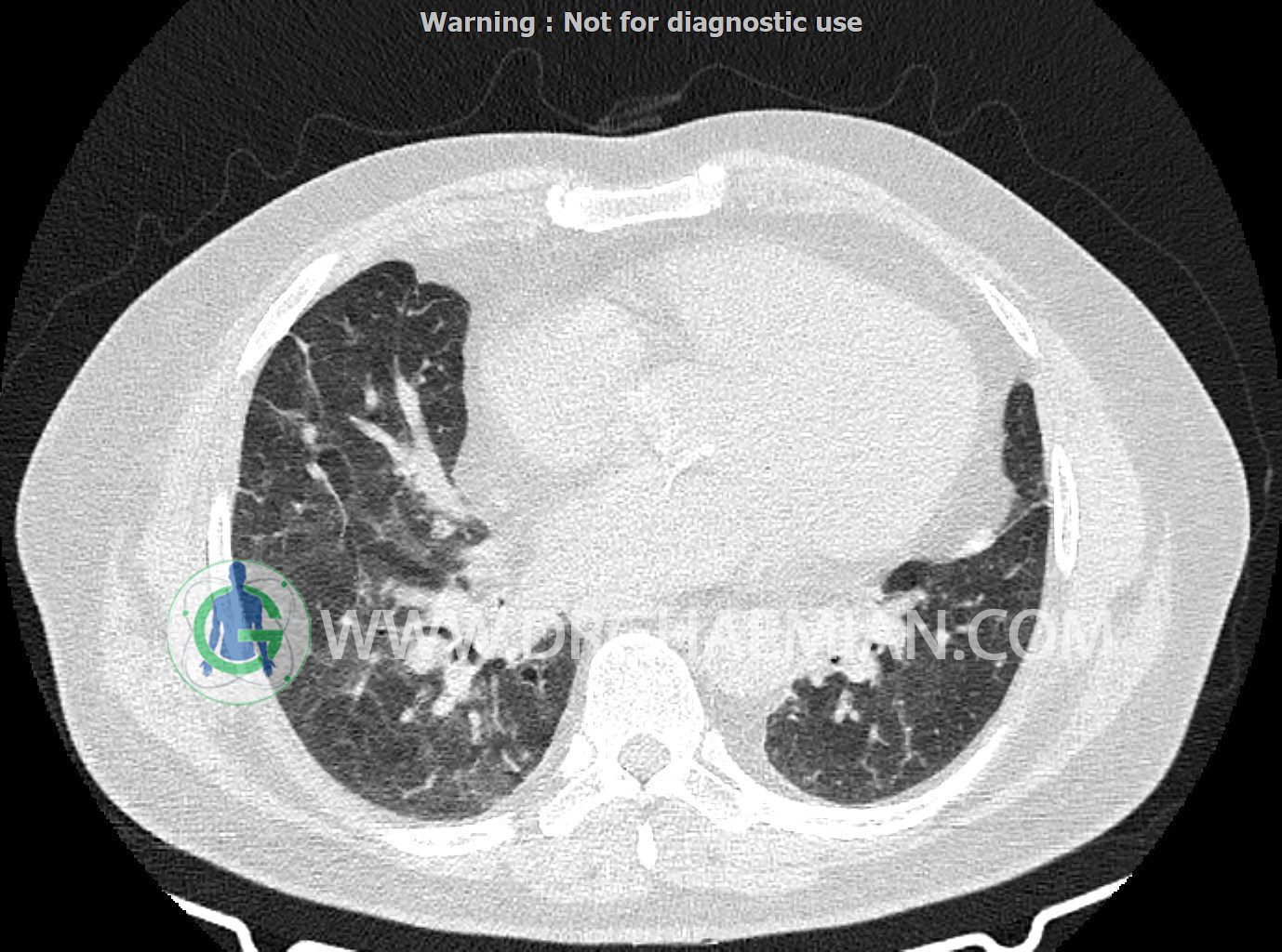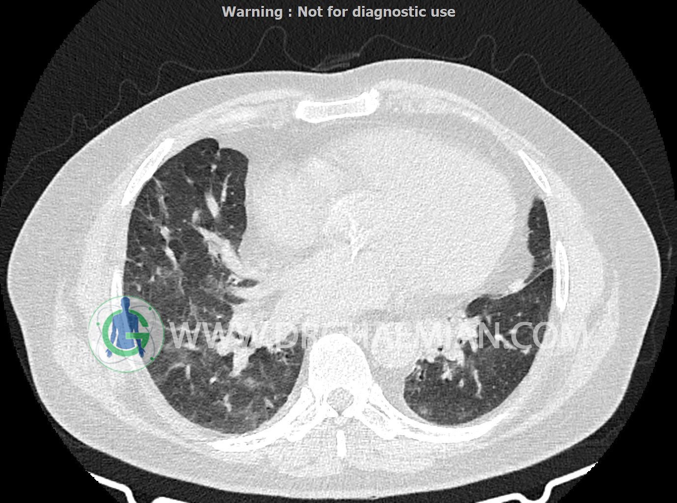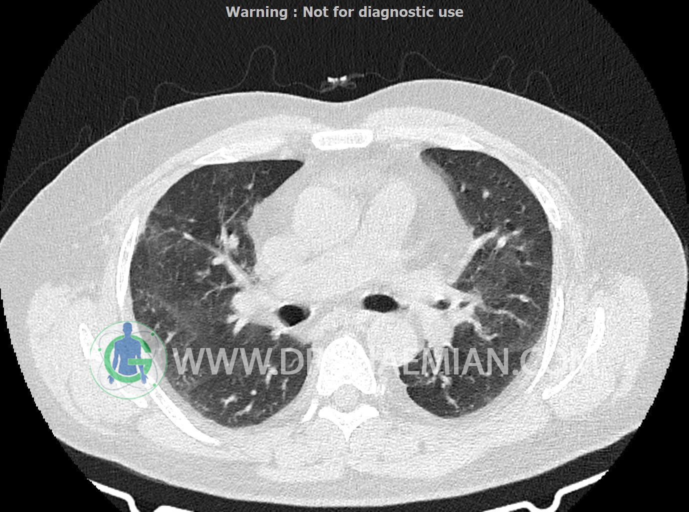 سی تی اسکن ریه یک روش تصویربرداری است که با استفاده از تشعشعات تصاویر عرضی مقطعی از ریه و بالا تنه ایجاد می کند. در این کیس کاردیومگالی،باندهای آتلکتازی و فیبروتیک پراکنده،کدورت های گراند گلاس،زمینه ی ادم قلبی (مراحل اولیه)،مشهده میشود.