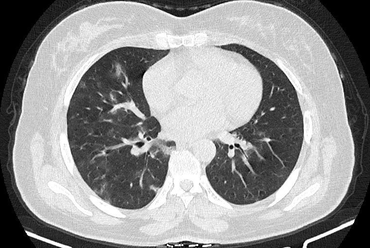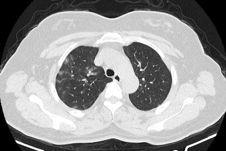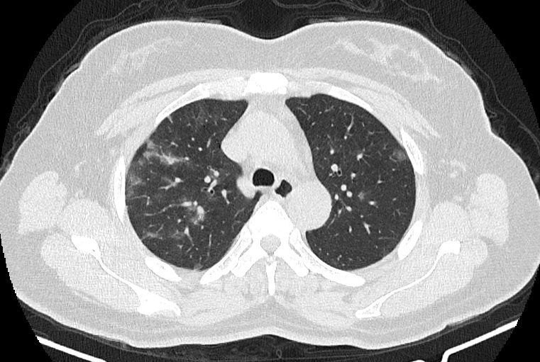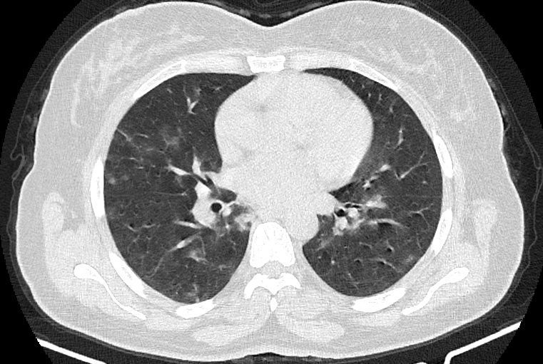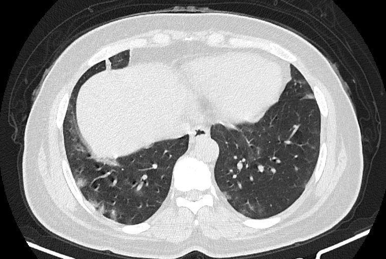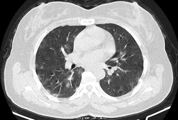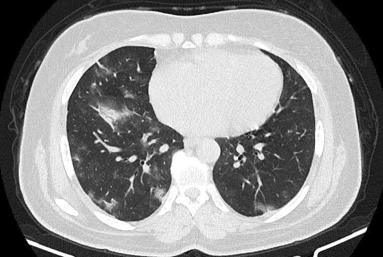 -Ground glass opacities Patchy پراکنده در ريه ها مشهود است که مطرح کننده Viral pneumonia مي باشد . ( با درگيري 20 درصد حجم ريه )