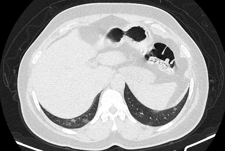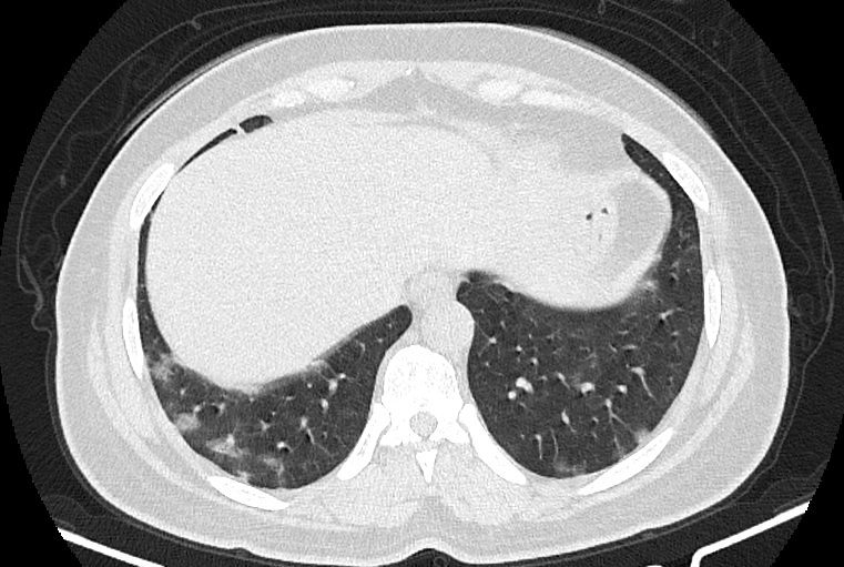 در HRCT از ريه ها(اسپيرال ، مولتي ديتکتور 16، مقاطع اگزيال با ضخامت 1mm بدون فاصله ) ، بدون كنتراست تزريقي :