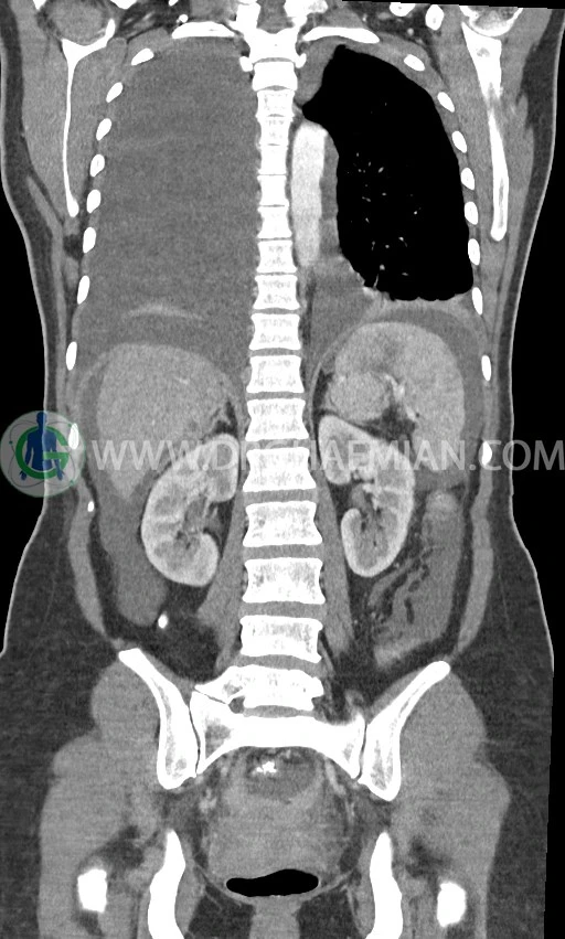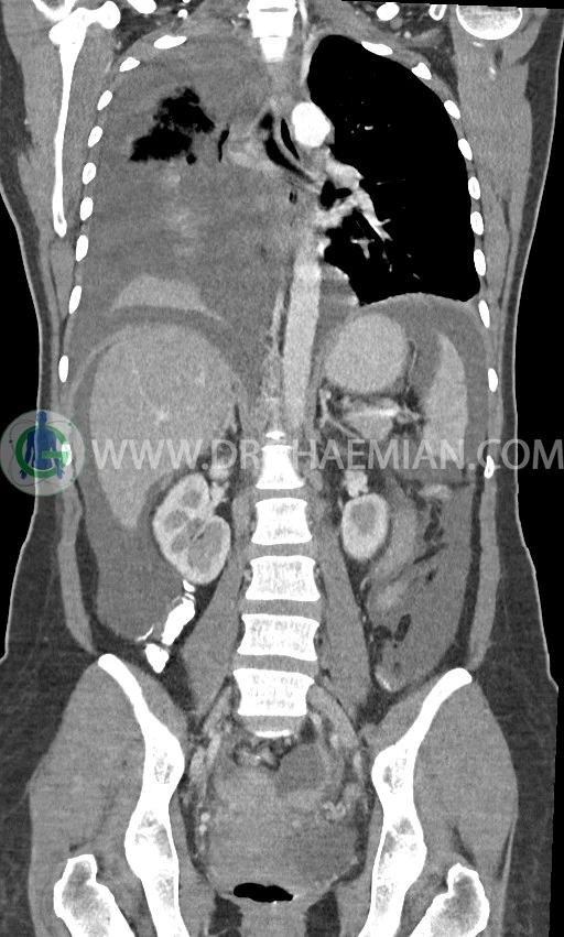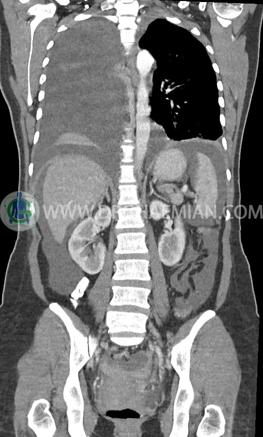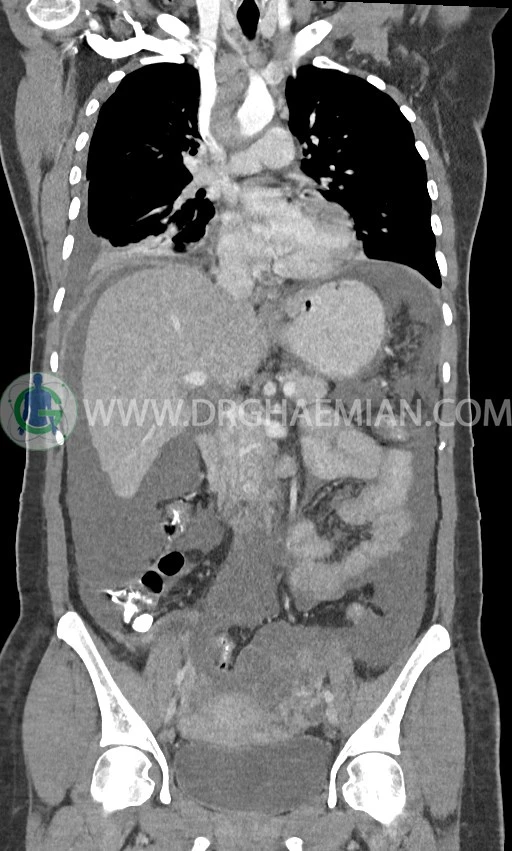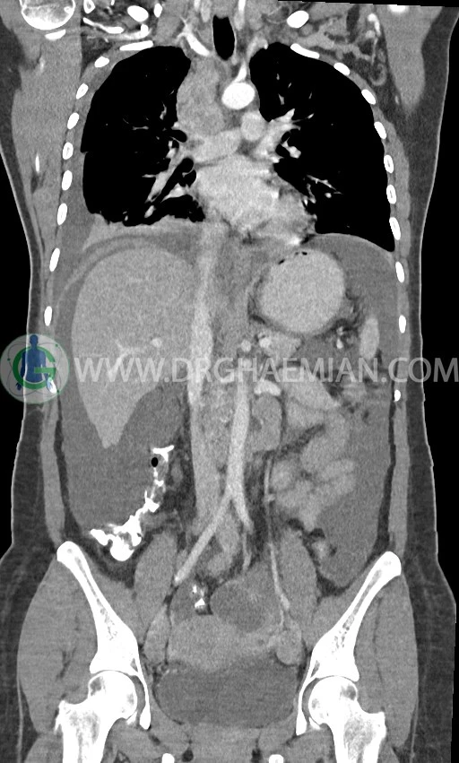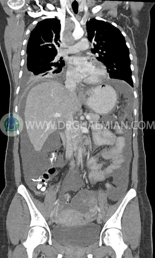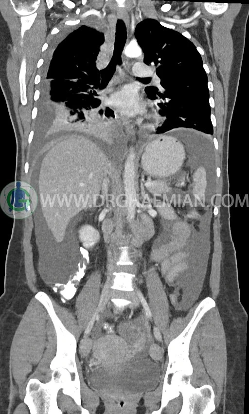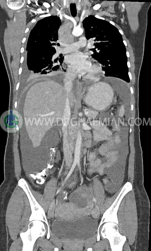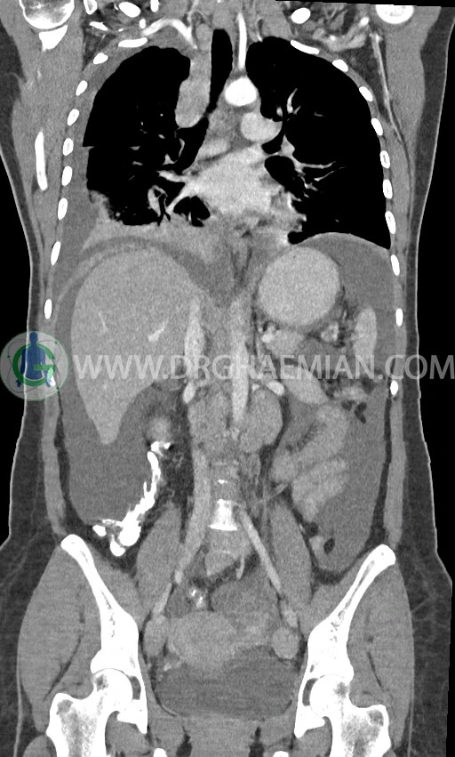 در سی تی اسکن اسپیرال ریه، مدیاستن و شکم و لگن با کنتراست خوراکی و وریدی (مولتی دیدکتور 16 با مقاطع ظریف و بازسازی های ساژیتال و کرونال) :