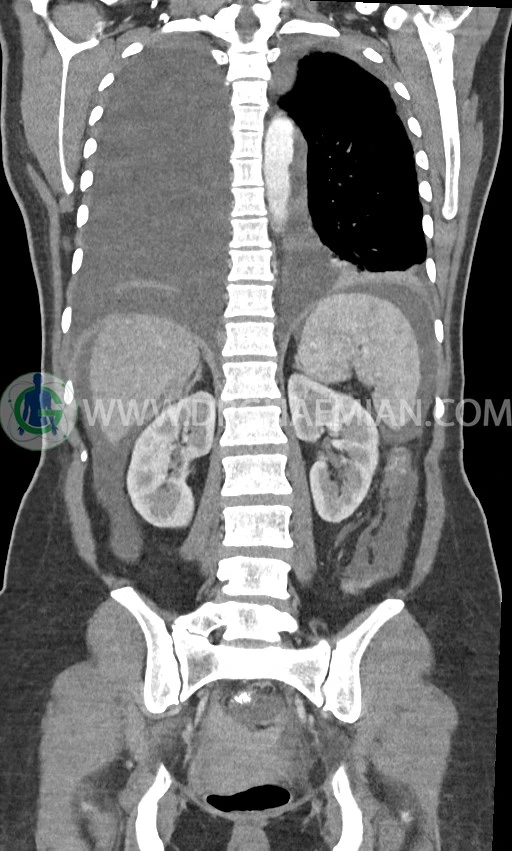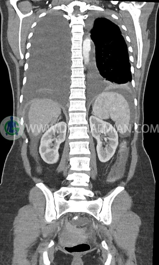 سی تی اسکن ریه با استفاده از اشعه ایکس تصاویر عرضی مقطعی از ریه و بالا تنه ایجاد می کند. در این کیس افیوژن پلور، لنفادنوپاتی، تخریب ریه سمت راست، توده پستان، آسیت و توده تخمدان دیده می شود.