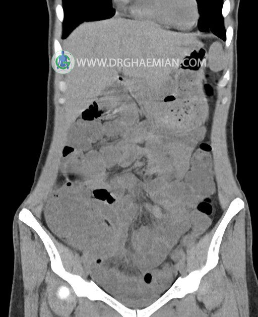 مايع آزاد در حفره شکم و لگن رويت نمی شود.