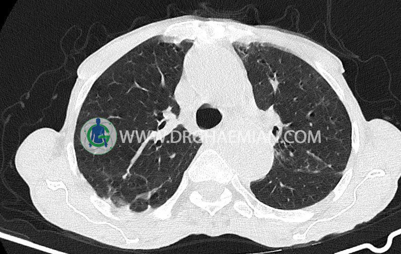 – ندول هاي ساليد ground glass با توزيع پري برونکيال همراه با برونشکتازي سيلندريک در لينگولا و