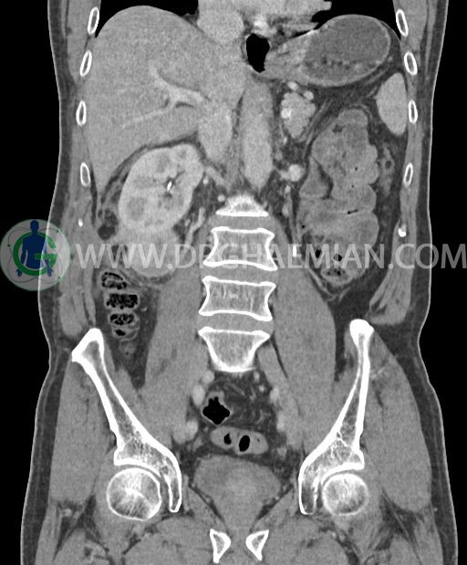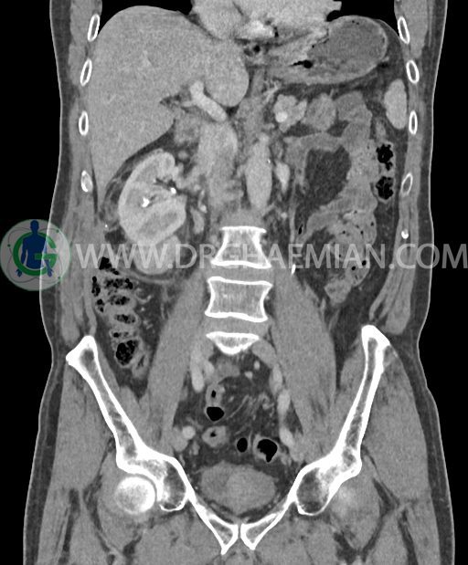 در سی تی اسکن اسپیرال شکم و لگن با کنتراست خوراکی و وریدی (مولتی دیدکتور 16 با مقاطع ظریف و بازسازی های ساژیتال و کرونال) :