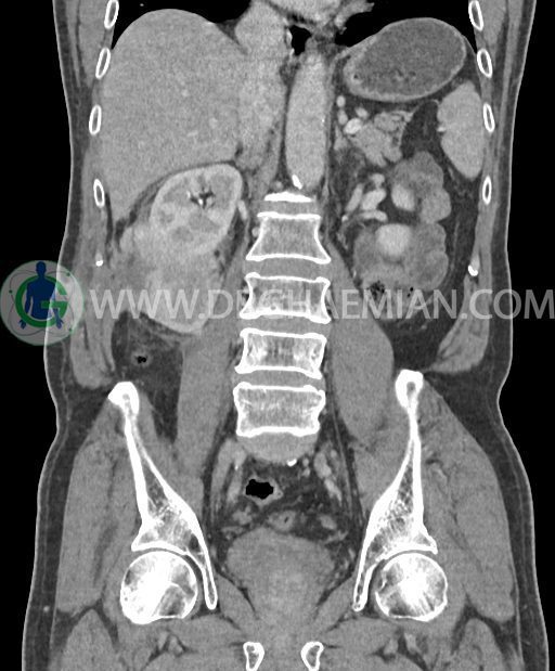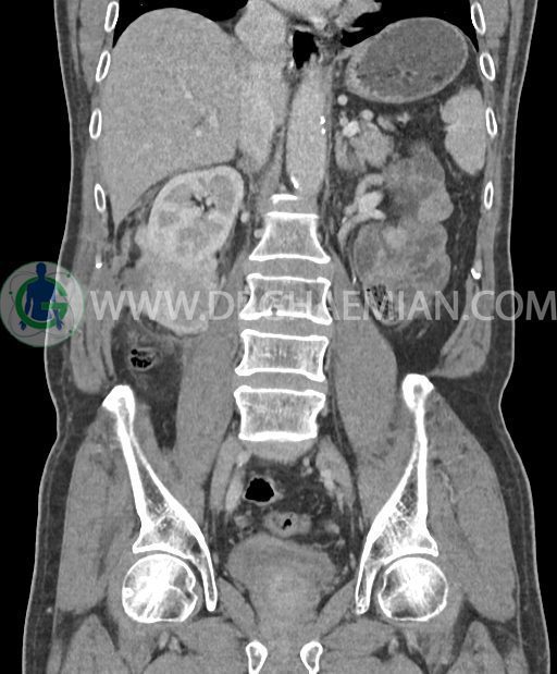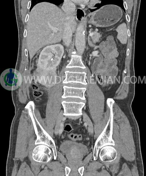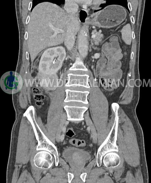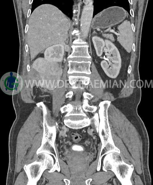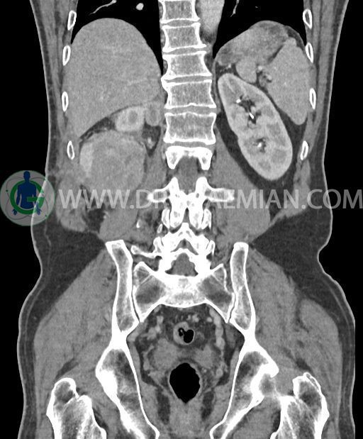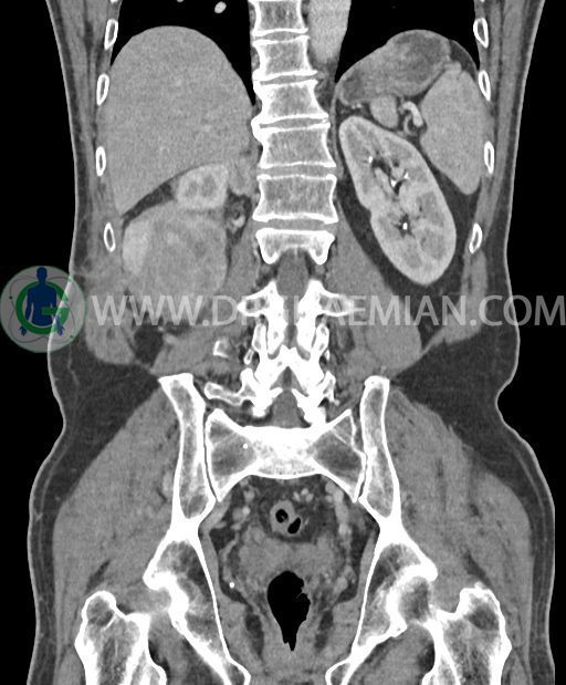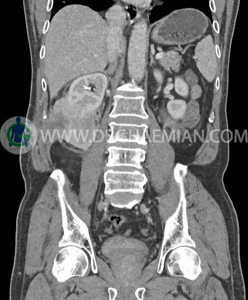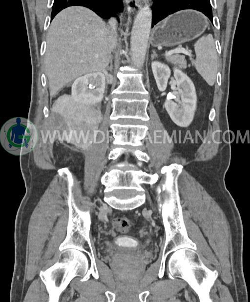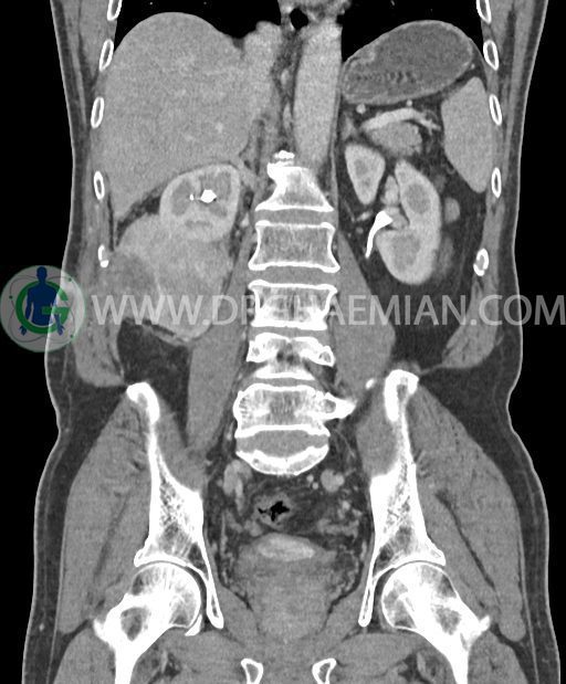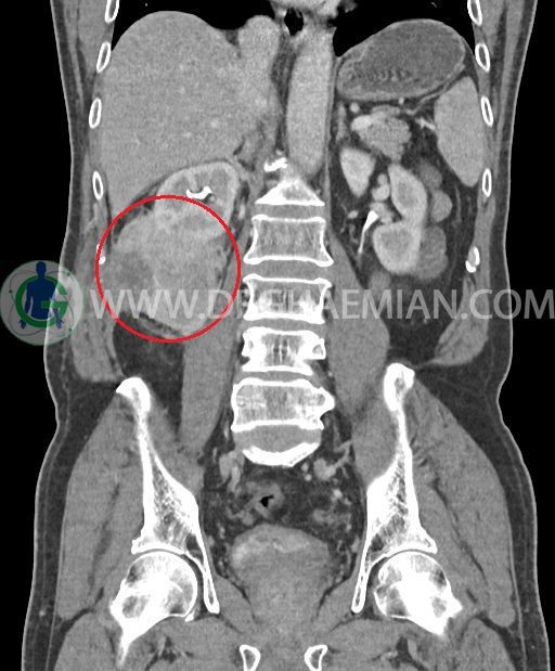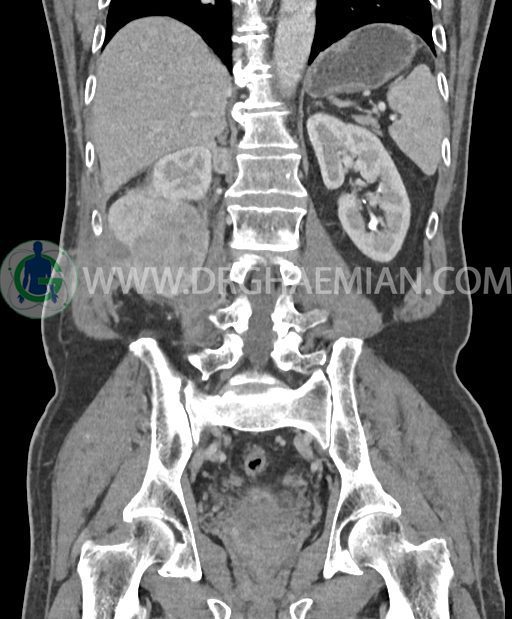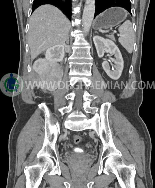 در پل تحتانی کلیه راست رویت شد که به ورای فاشیای Gerota گسترش داشته و به عضلات جدار شکم در این