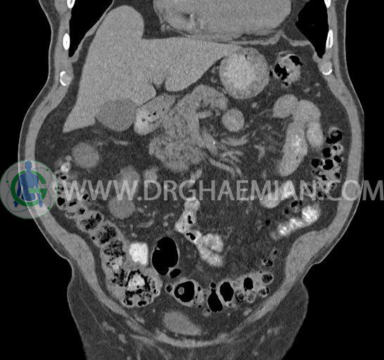 – توده ايزودنس به ابعاد mm 17 x 28 در پره ائورت مجاور قسمت تحتاني D3 دئودنوم مطرح کننده لنفادنوپاتي و با احتمال کمتر آنوريسم ترومبوزه (نيازمند مطابقت سونولوژيک)