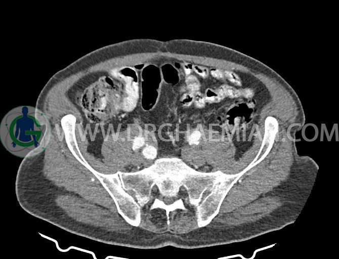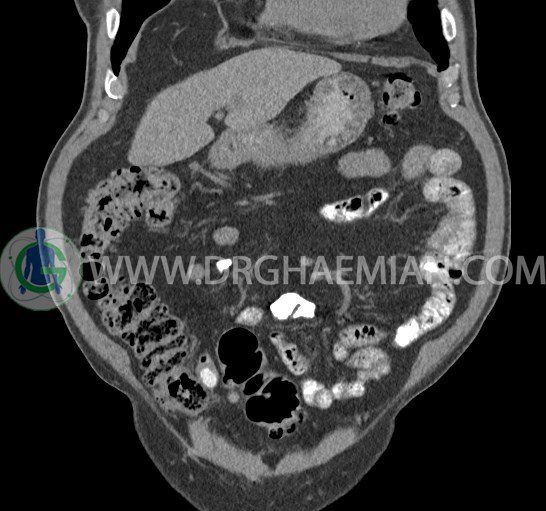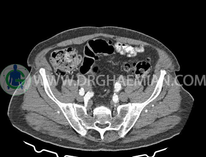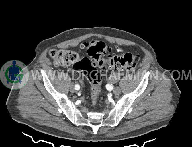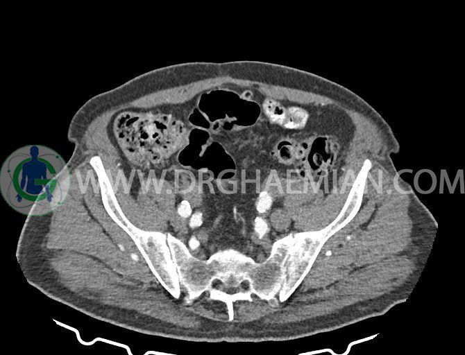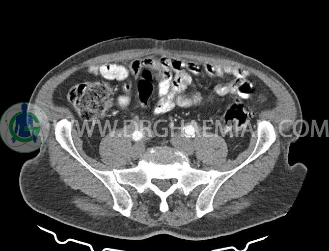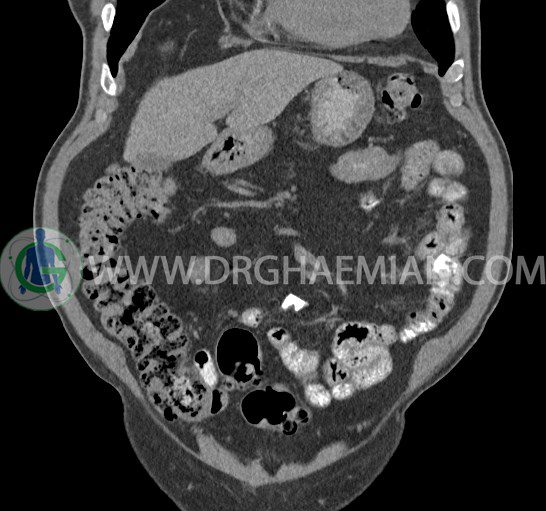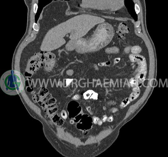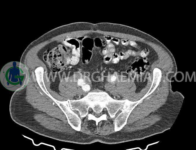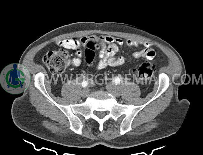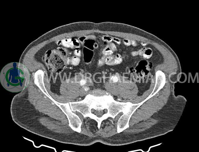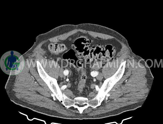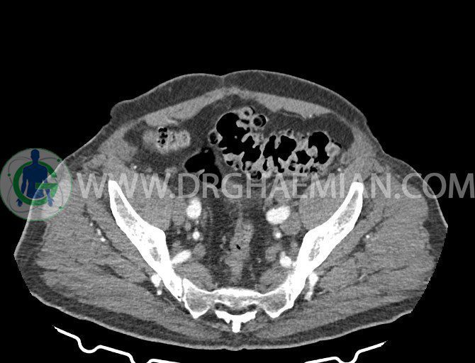 – کلسيفيکاسيون ديواره آئورت و شريان ها ايلياک همراه با نشانه هاي ترومبوز مورال در بيفورکاسيون ائورت با امتداد به پروگزيمال هاي شريان هاي ايلياک