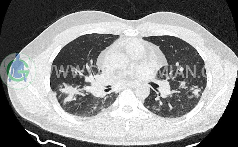 کدورت های ندولار متعدد دو طرفه بعضا اسپیکوله همراه با consolidation های پری برونکووسکولار دو طرف