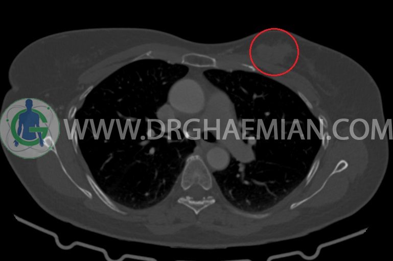 سی تی اسکن ریه با استفاده از تشعشعات تصاویر عرضی از نواحی ریه ایجاد میکند. در این کیس سرطان پستان، سه توده در کبد و رحم بزرگتر از نرمال دیده می شود.