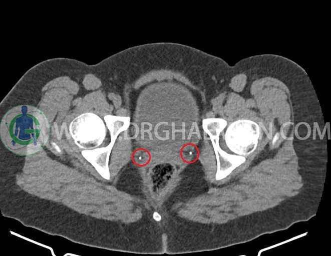 سی تی اسکن شکم و لگن با استفاده از تشعشعات تصاویر عرضی از ناحیه شکم و لگن ایجاد میکند. در این کیس دو فلبولیت کوچک در لگن، چند گره اشمورل در مهره های کمری دیده می شود.