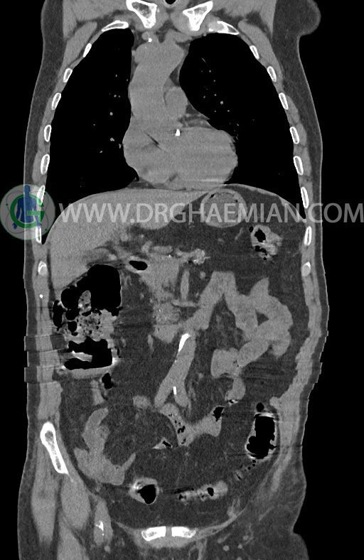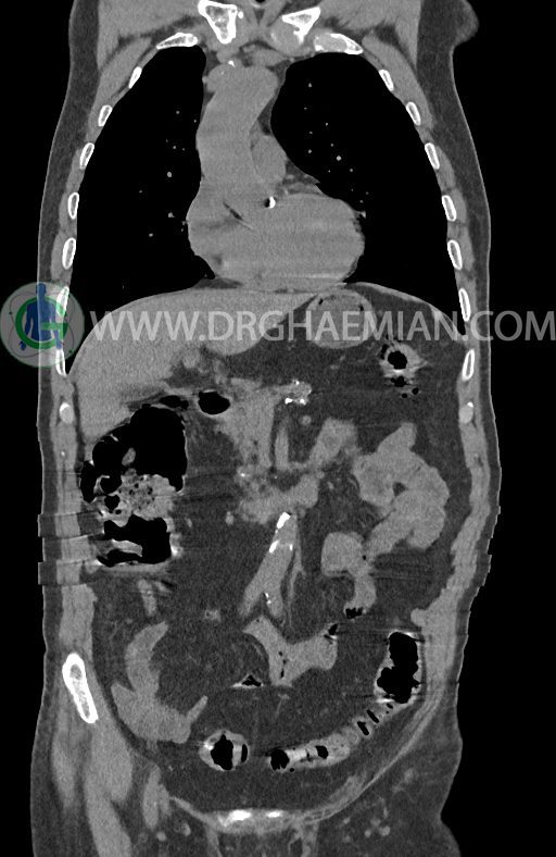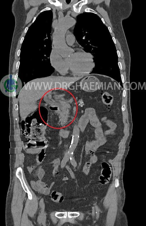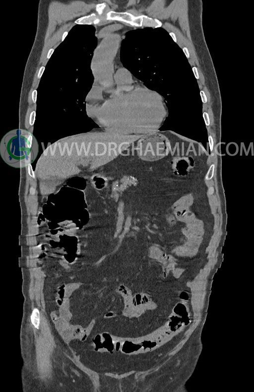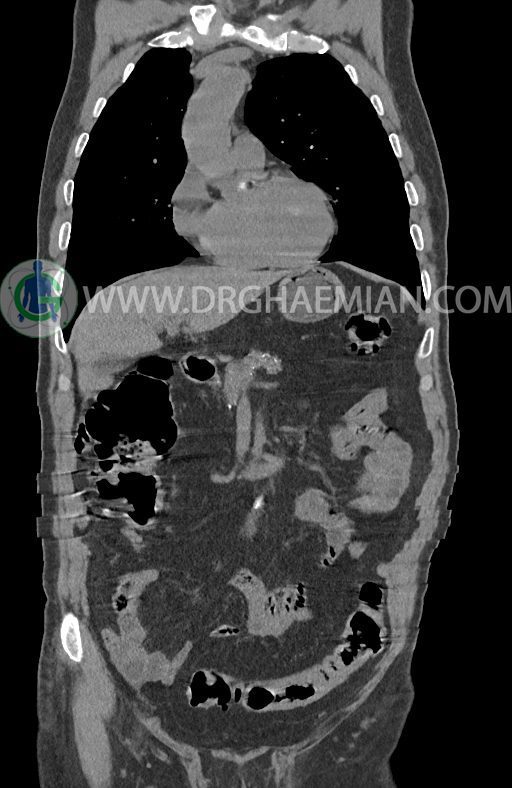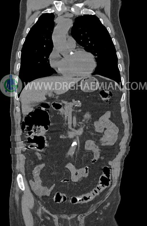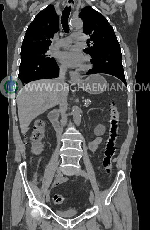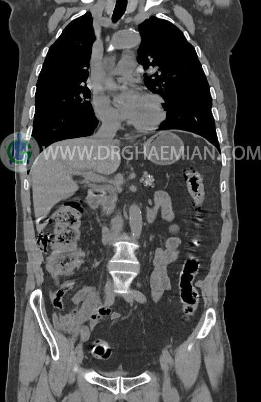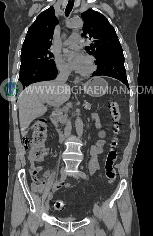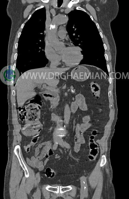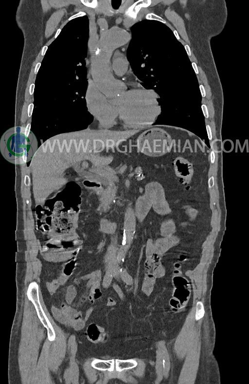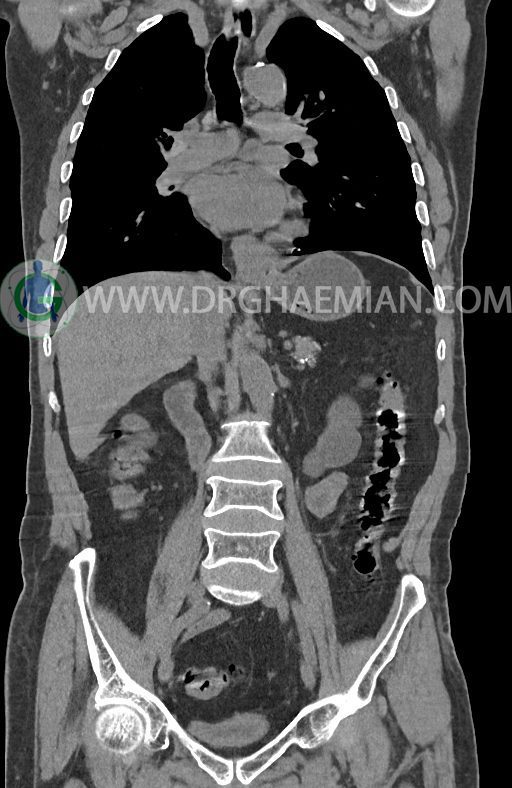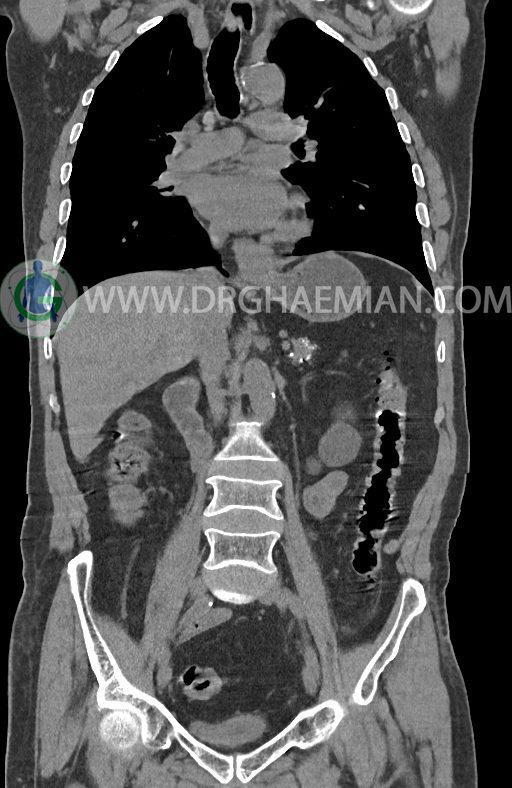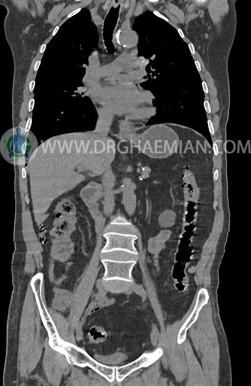 سی تی اسکن شکم و لگن با استفاده از اشعات ایکس تصاویر عرضی از ناحیه شکم و لگن ایجاد میکند. در این کیس پانکراتیت (التهاب پانکراس)، کیست های کورتیکال در هر دو کلیه، پروستات بزرگتر از نرمال و … مشاهده می شود.
