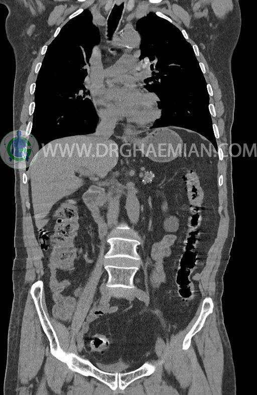 در سی تی اسکن اسپیرال ریه ها و مدیاستن، شکم و لگن با و بدون کنتراست وریدی (مولتی دیدکتور 16 با مقاطع ظریف و بازسازی کرونال) :
