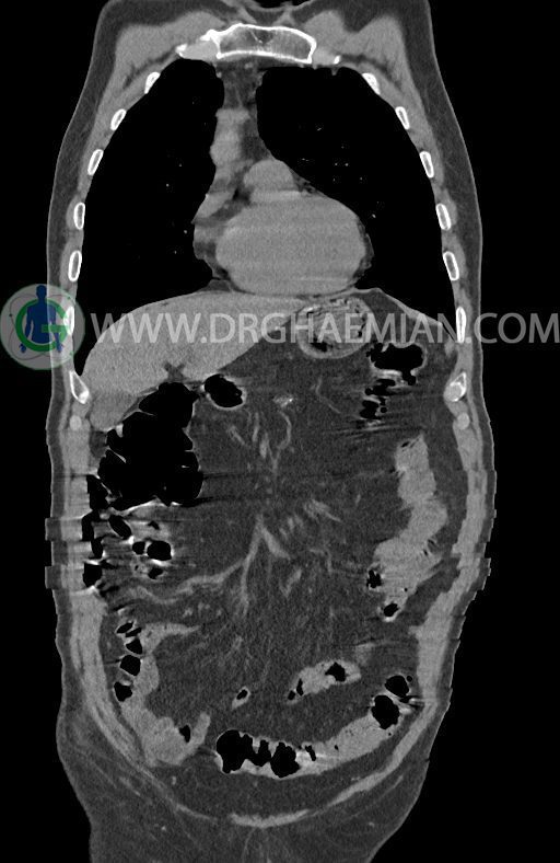 مایع آزاد در حفره شکم و لگن رویت نمی شود.