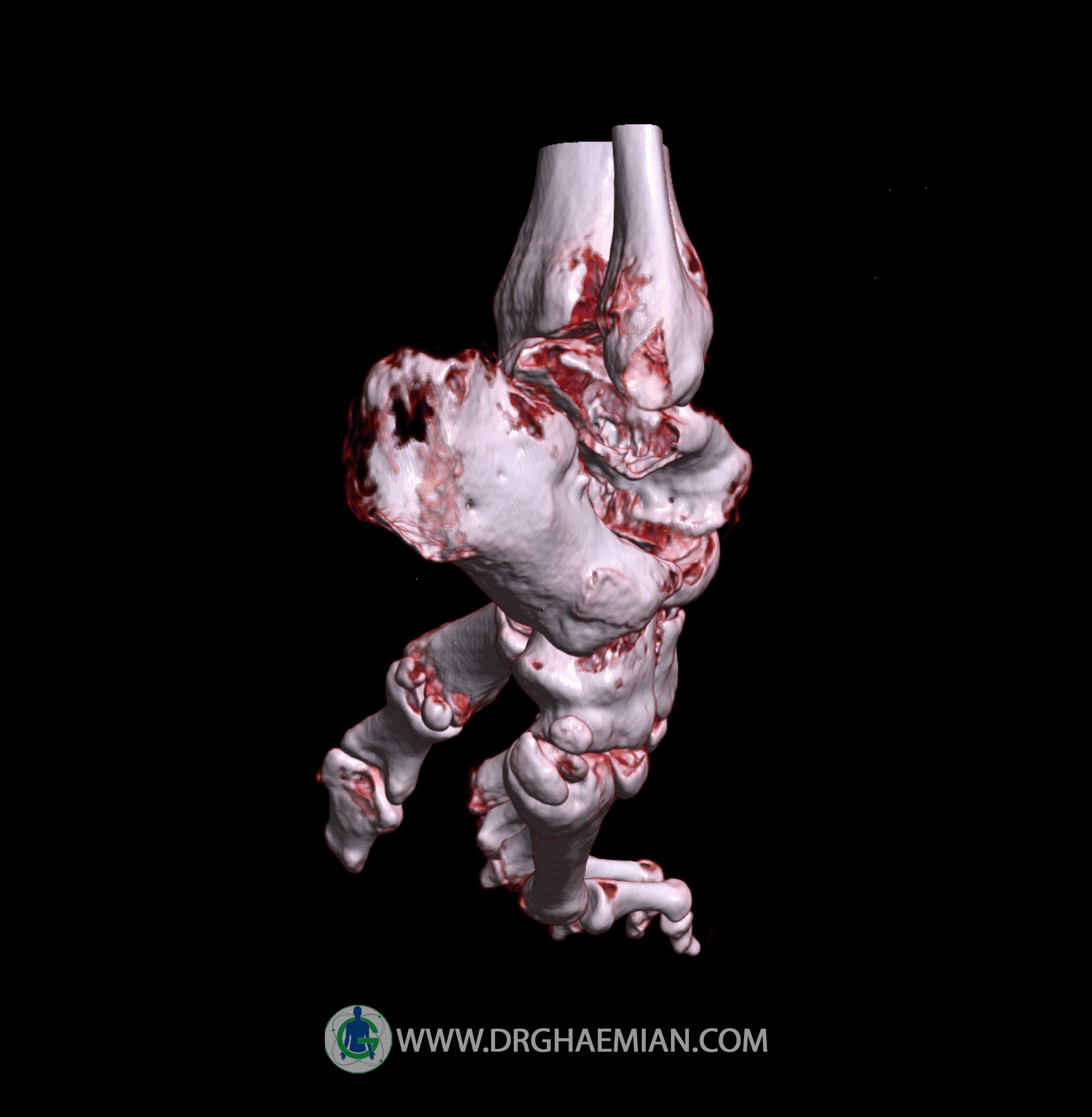 سی تی اسکن مفاصل از پرتوی نازک تششعات و حلقه ایی از تششعات که به سرعتی بالا حرکت می کنند برای گرفتن اطلاعات از زوایای مختلف استفاده می کند که خود برای ایجاد تصاویر عرضی مقطعی استفاده می شود. در این سی تی اسکن پاچنبری و تورم نسج نرم دیده می شود.