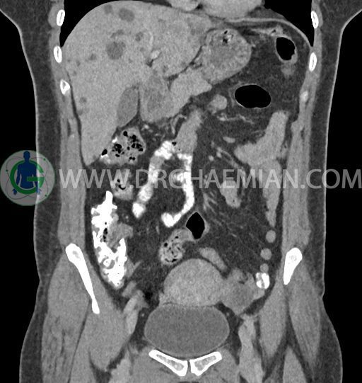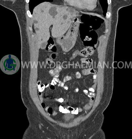 در سی تی اسکن اسپیرال شکم و لگن – 5Phasic (بدون کنتراست – با کنتراست در فاز آرتریال ، پورتال و تاخیری 5 دقیقه و 10 دقیقه، مولتی دیدکتور 16 با مقاطع ظریف و بازسازی های ساژیتال و کرونال) :