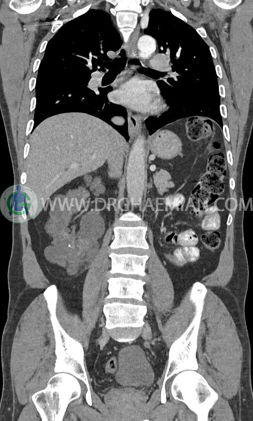 نشانه های ADPKD در کلیه راست بزرگ تر از نرمال ( 90x160mm ) ، همراه با کیستهای فراوان به قطر تا 40mm و سنگهای فراوان به قطر تا 12mm
