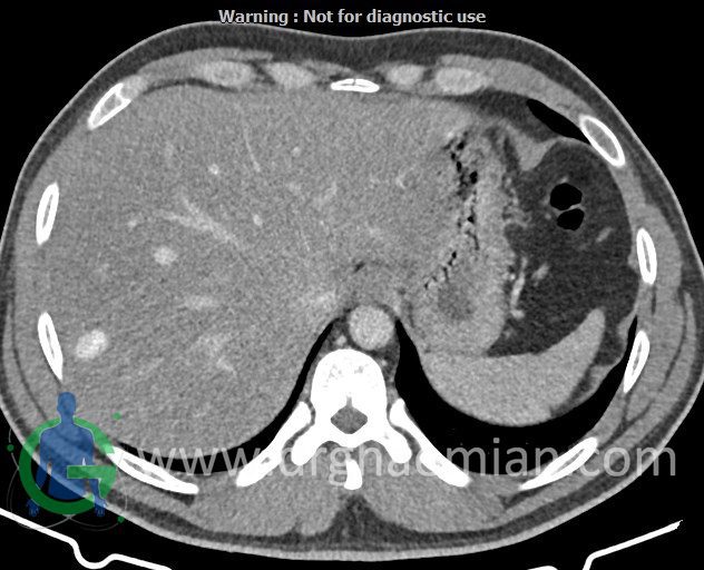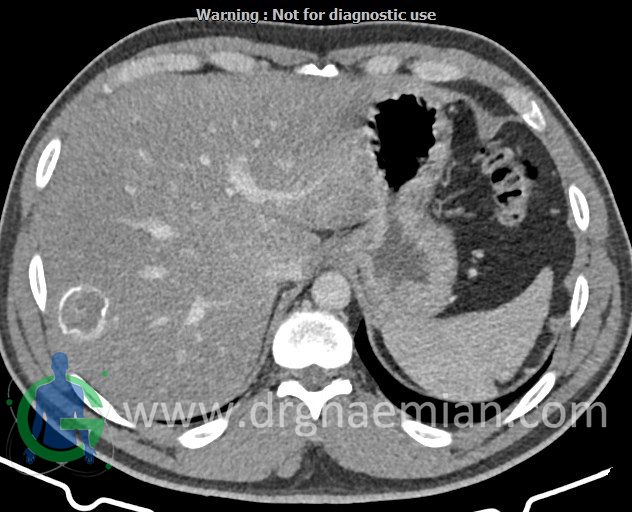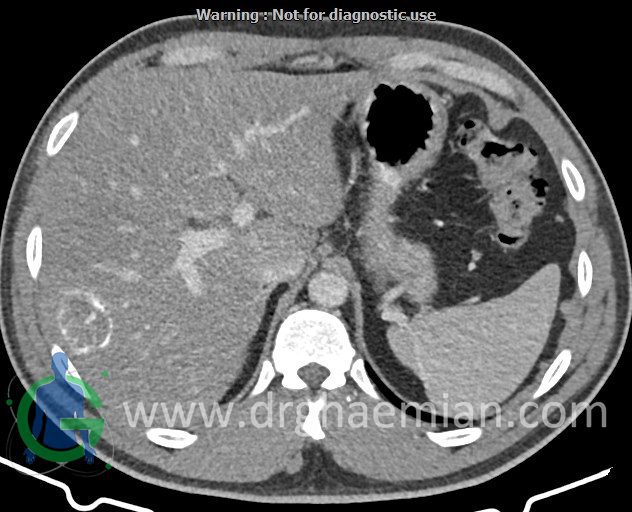 – ضایعه ی هیپودنس فاقد Enhancement با حدودی معین حاوی complete rim calcification جداری به ابعاد 38x27mm در سگمان 7 کبد مشهود است که مطرح کننده یtype III calcified hydatid cyst (died cyst) می باشد.