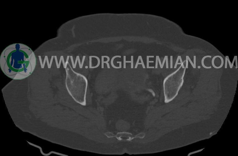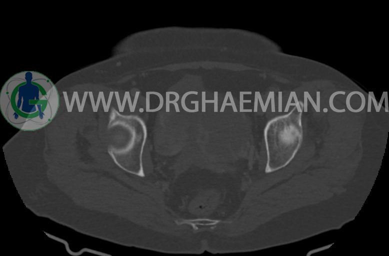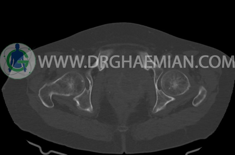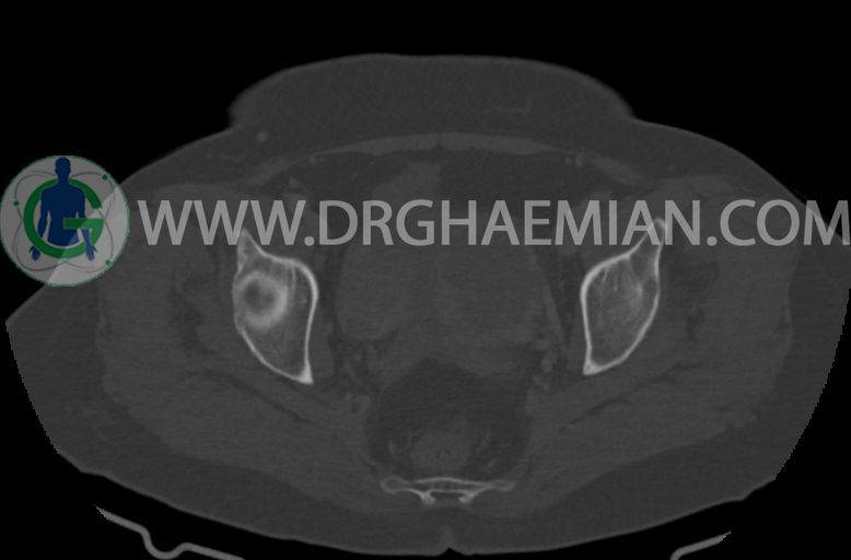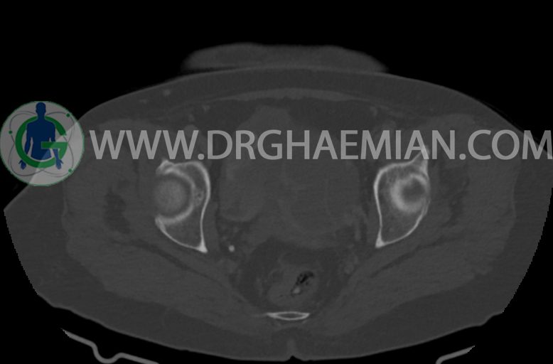 سی تی اسکن شکم و لگن با استفاده از اشعات ایکس تصاویر عرضی از ناحیه شکم و لگن ایجاد میکند. در این کیس موسینوس کیست آدنوما، شواهد هیسترکتومی، ضایعه در سمت راست لگن، کیست در کبد و … دیده می شود.