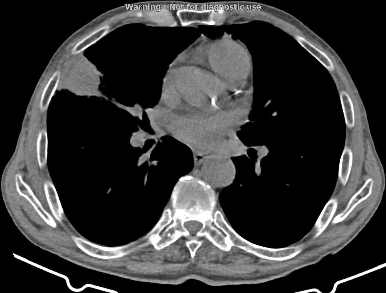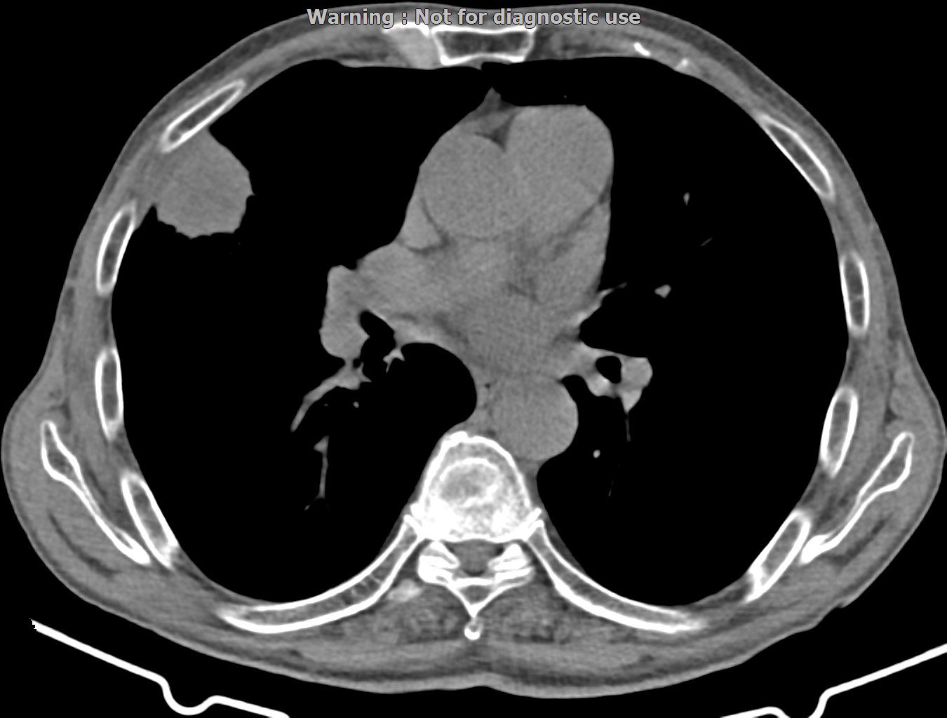 – ضایعه ی solid/lytic با قسمت سنترال cystic و جداری ضخیم و نامنظم به ابعاد 35x31mm در ناحیه ی ساب پلورال RML مشهود است که در درجه اول به نفع یک متاستاز نکروتیک (با توجه به شرح حال تومور مثانه ) و یا ضایعه نئوپلازیک اولیه ی ریوی می باشد. CNB جهت بررسی بیشتر توصیه می شود.