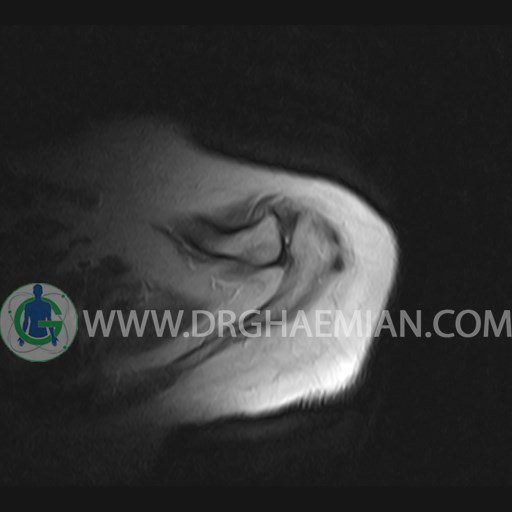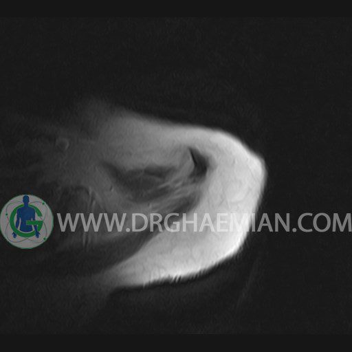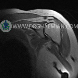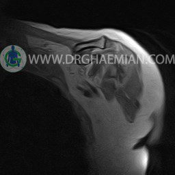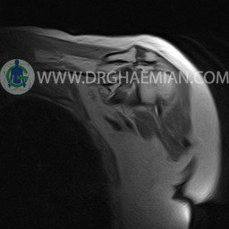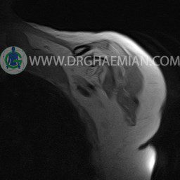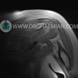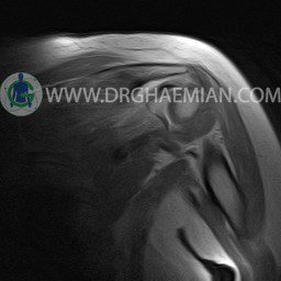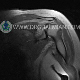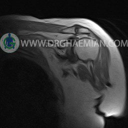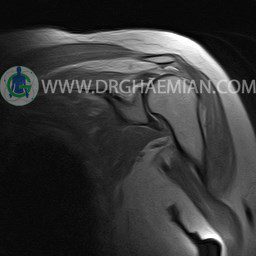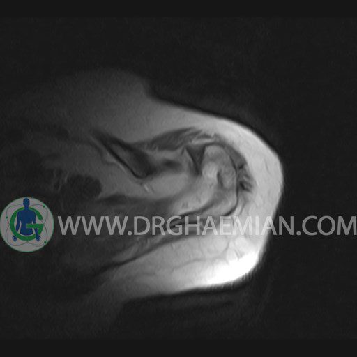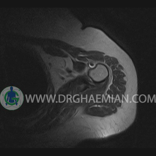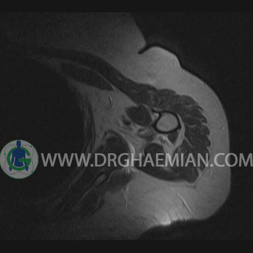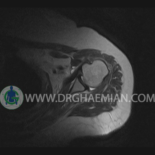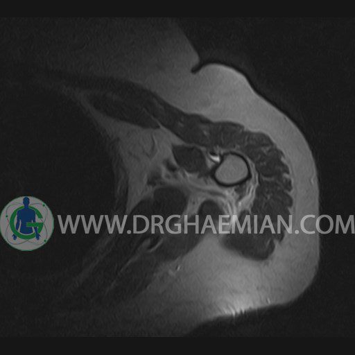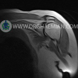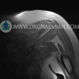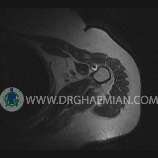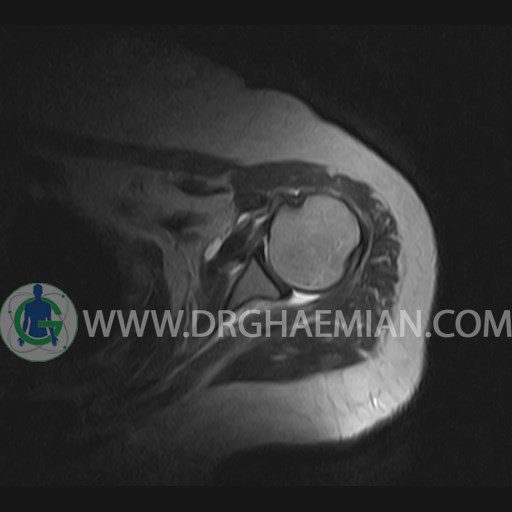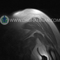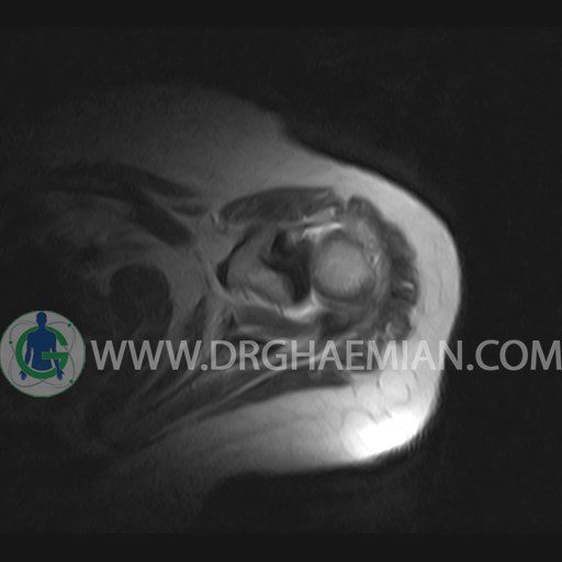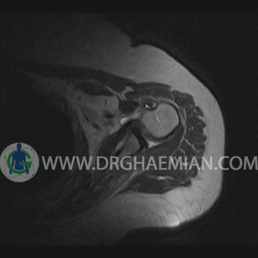 ام ار آی کتف یک روش تصویربرداری است که به وسیله آهنرباهای قدرتمند از قسمت کتف تصاویری ایجاد می کند. این نوع تصویربرداری از تشعشعات استفاده نمی کند. در این کیس آتروفی عضلانی کتف به همراه پارگی تاندون بالاخاری، بورسیت ساب دلتوئید و افیوژن مفصل دیده می شود.