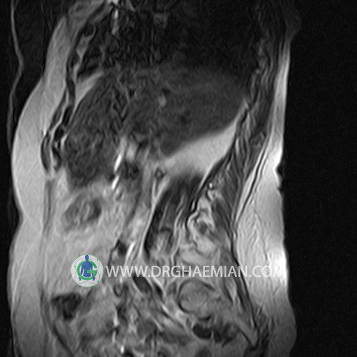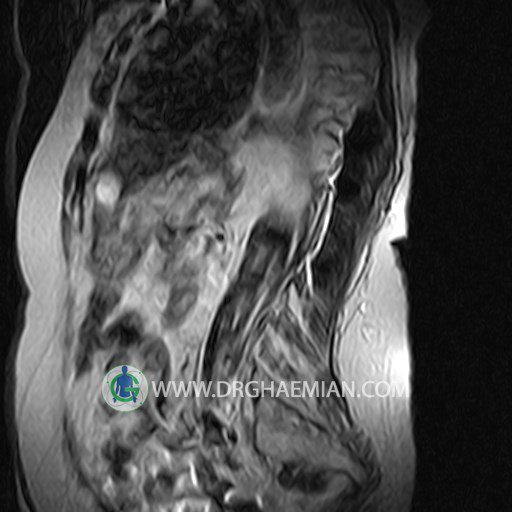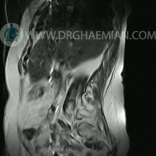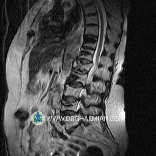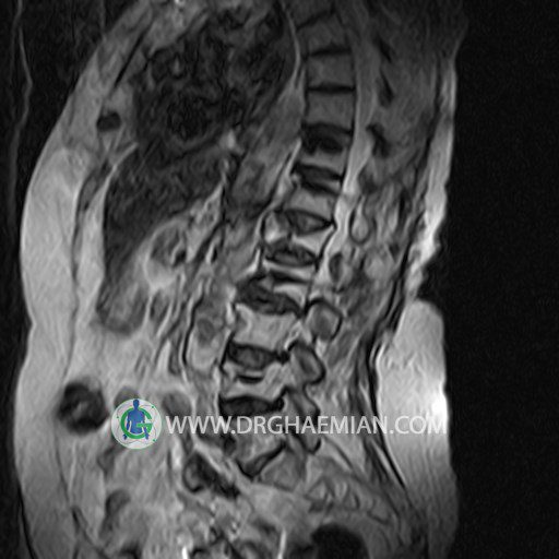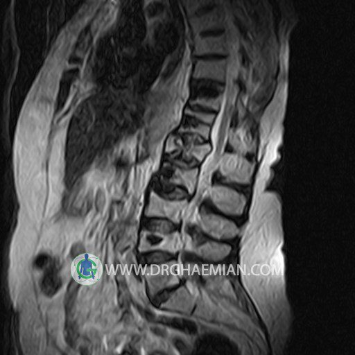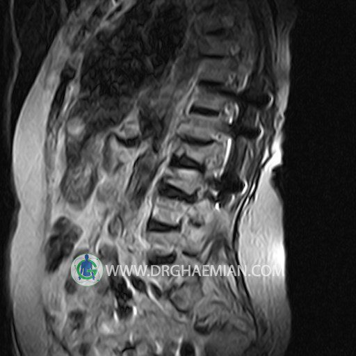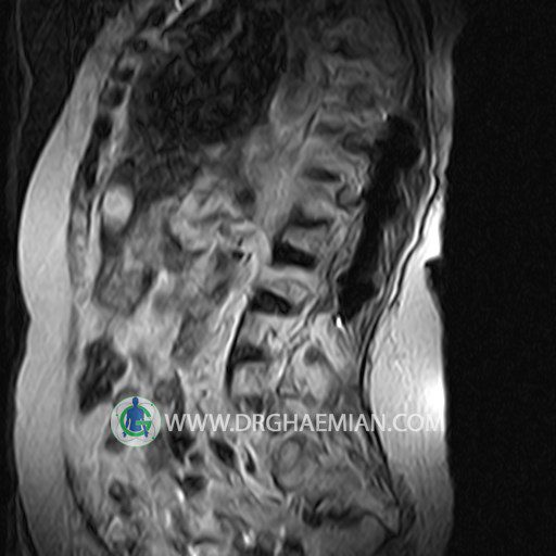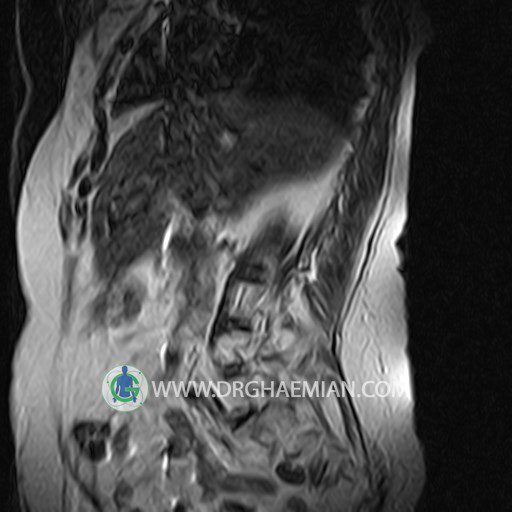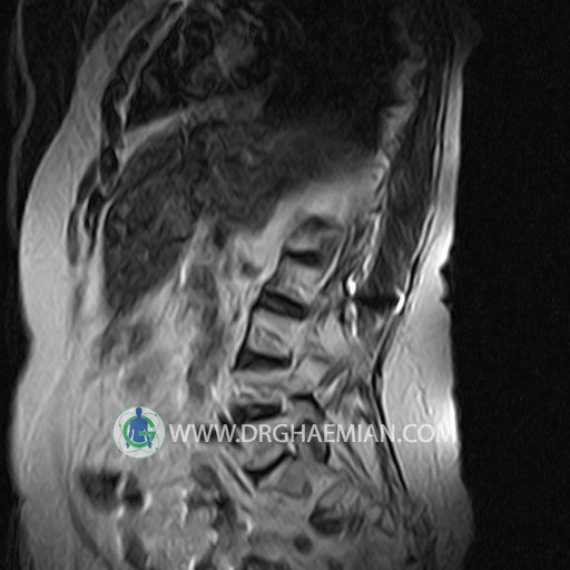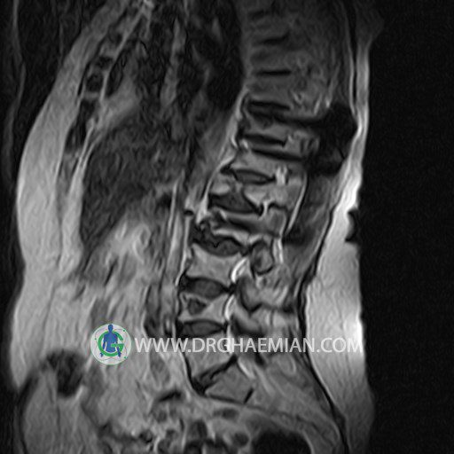 پزشکان اغلب از تصویربرداری ام آر آی برای تشخیص و درمان عارضه های پزشکی که فقط با استفاده از اشعه ایکس یا میدان مغناطیسی و امواج رادیویی قابل مشاهده است، استفاده می کنند. دستگاه ام آر آی تصاویر دقیق از ساختار های داخلی بدن ایجاد می کند. در این کیس اسکولیوز کمر، لامینکتومی مهره های T12,L1 و L2، شکستگی ها قدیمی در مهره های L4 ، L1 و L3، اسپوندیلوز، دیهیتراته و بیرون زده در مهره های L2/L3/L4/L5 و اسپوندیلوز بیاریک شدن، دیهیتراته و بیرون زدنگی در مهره های L5/S1 دیده می شود.