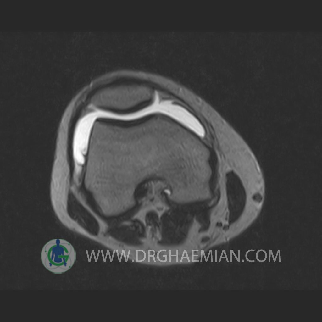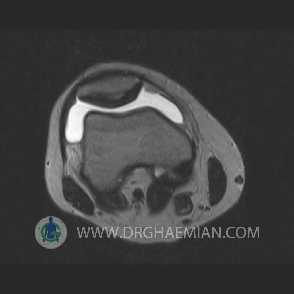 The hyaline cartilage covering patella, fermoral condyles and tibial plateau shows normal signal and thicknees.