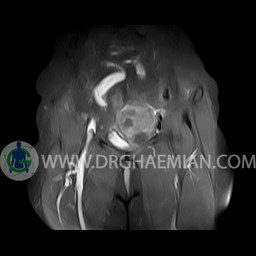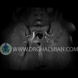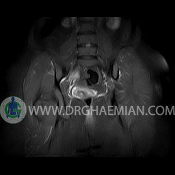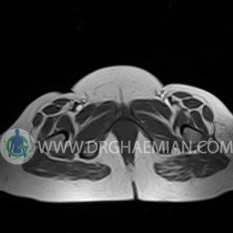 The femoral heads are normally shaped and articulate normally with the acetabula they have normal bone marrow signal characteristics.