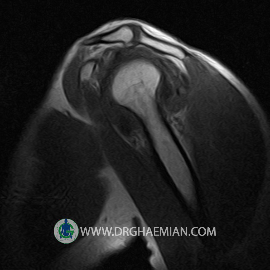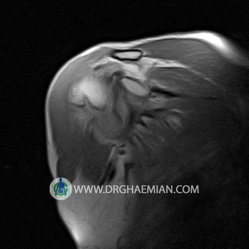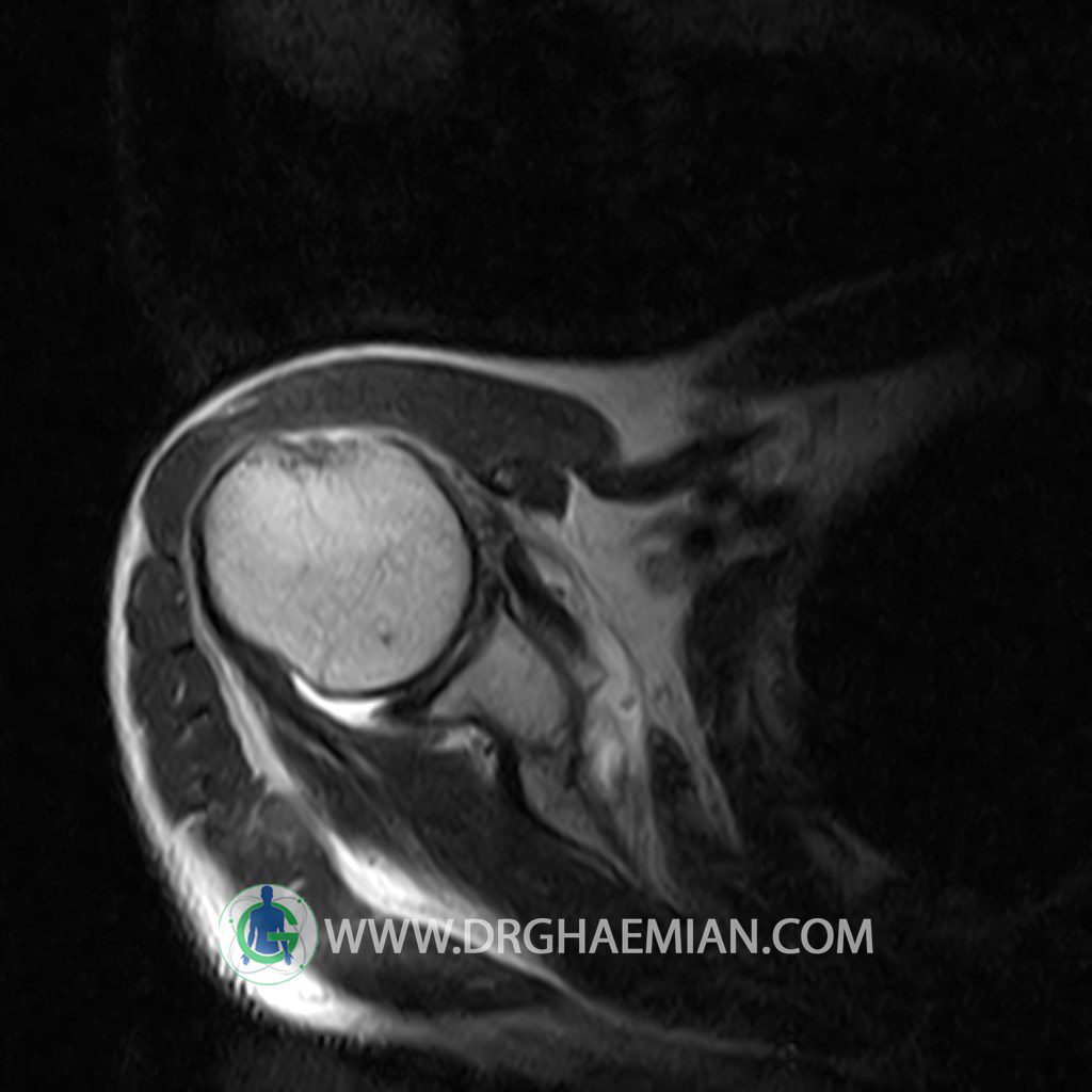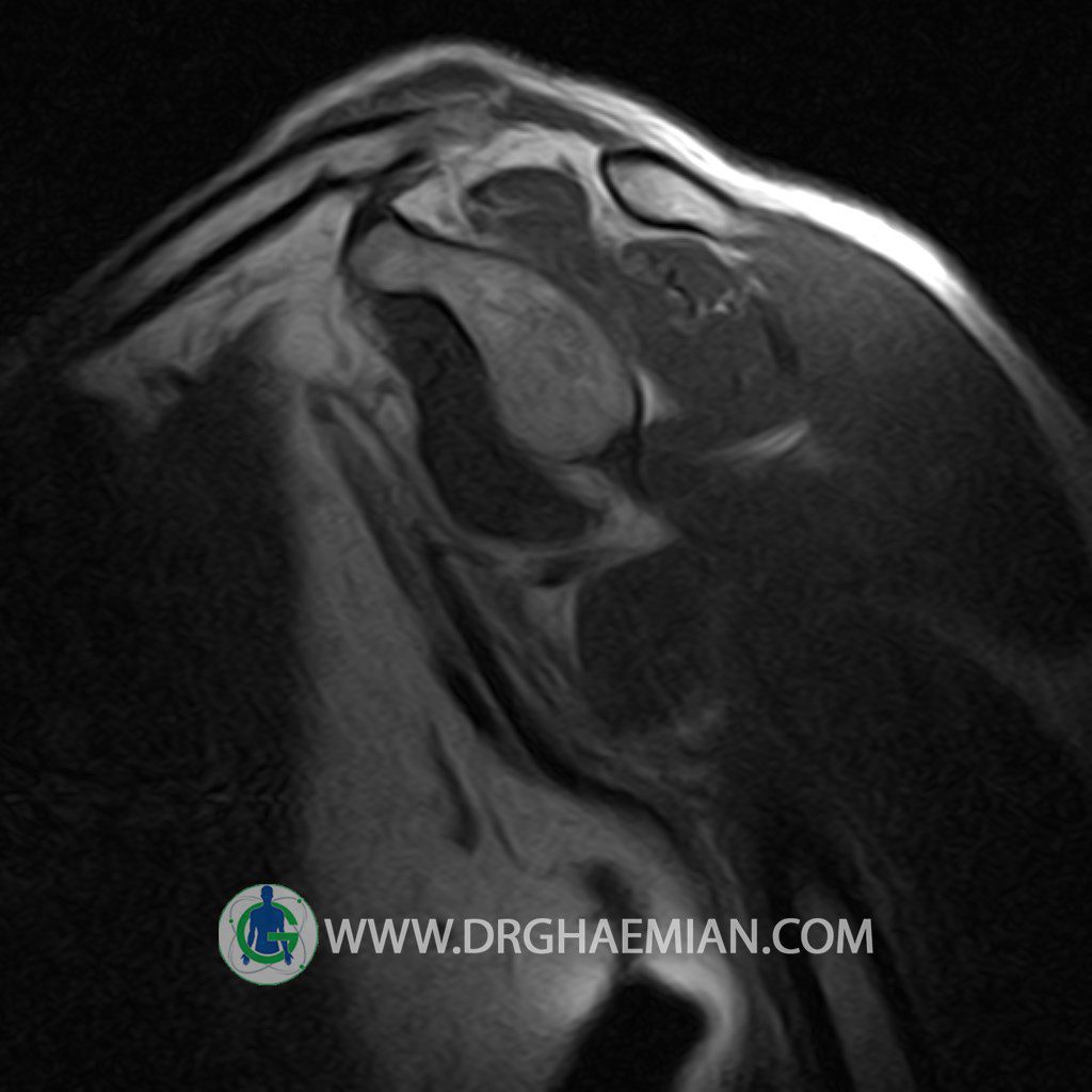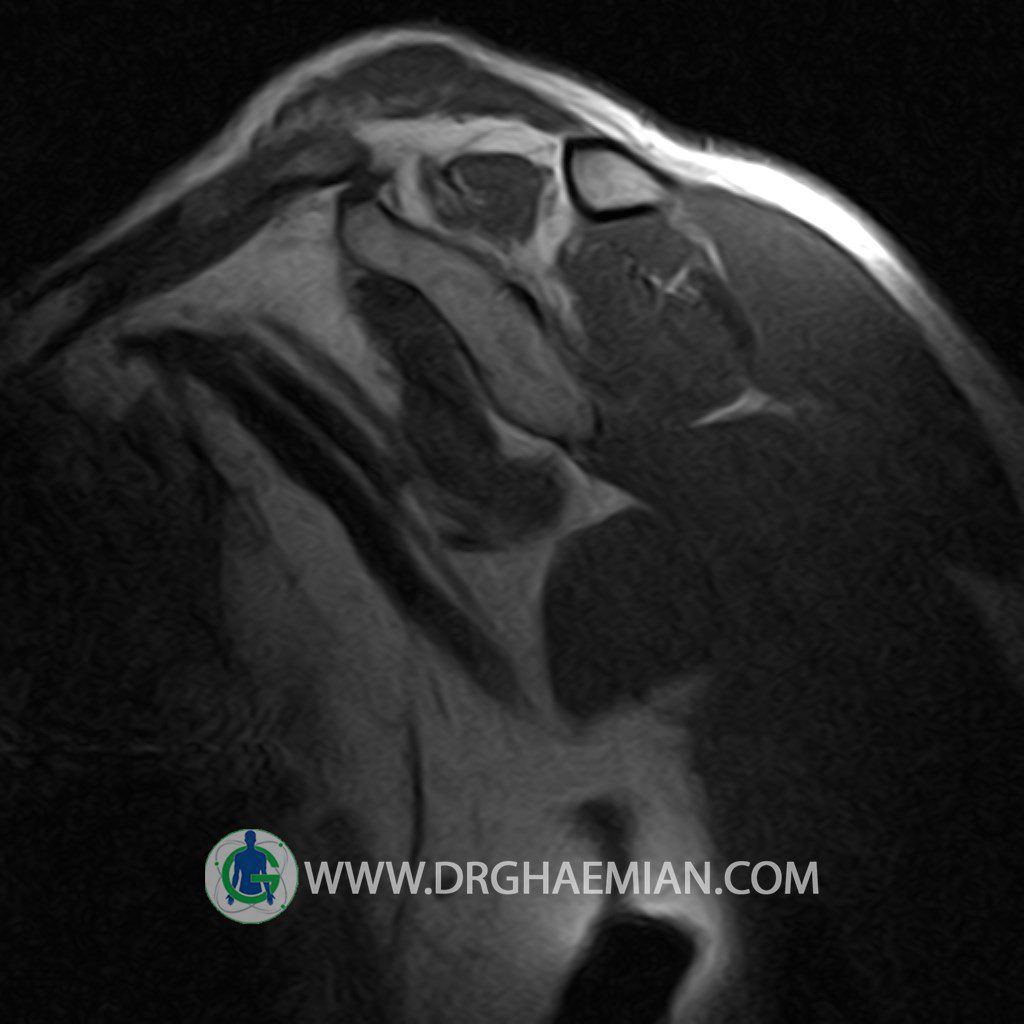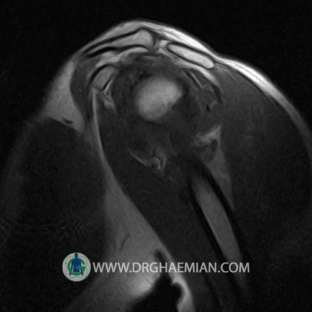 پزشکان اغلب از تصویربرداری ام آر آی برای تشخیص و درمان عارضه های پزشکی که فقط با استفاده از اشعه ایکس یا میدان مغناطیسی و امواج رادیویی قابل مشاهده است، استفاده می کنند. دستگاه ام آر آی تصاویر دقیق از ساختار های داخلی بدن ایجاد می کند. در این کیس بورسیت ساب دلتوئید شانه، پارگی و پیچ خوردگی تاندون و افیوژن مفصل شانه دیده می شود.