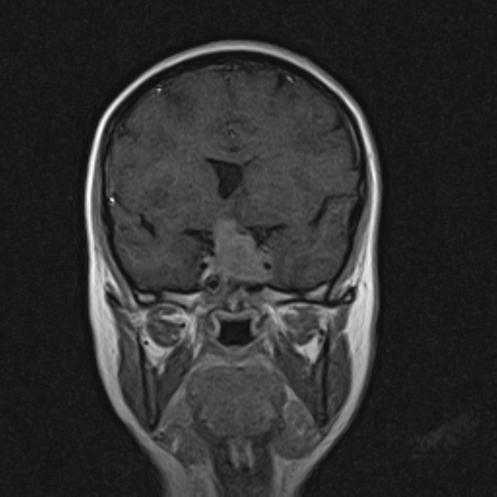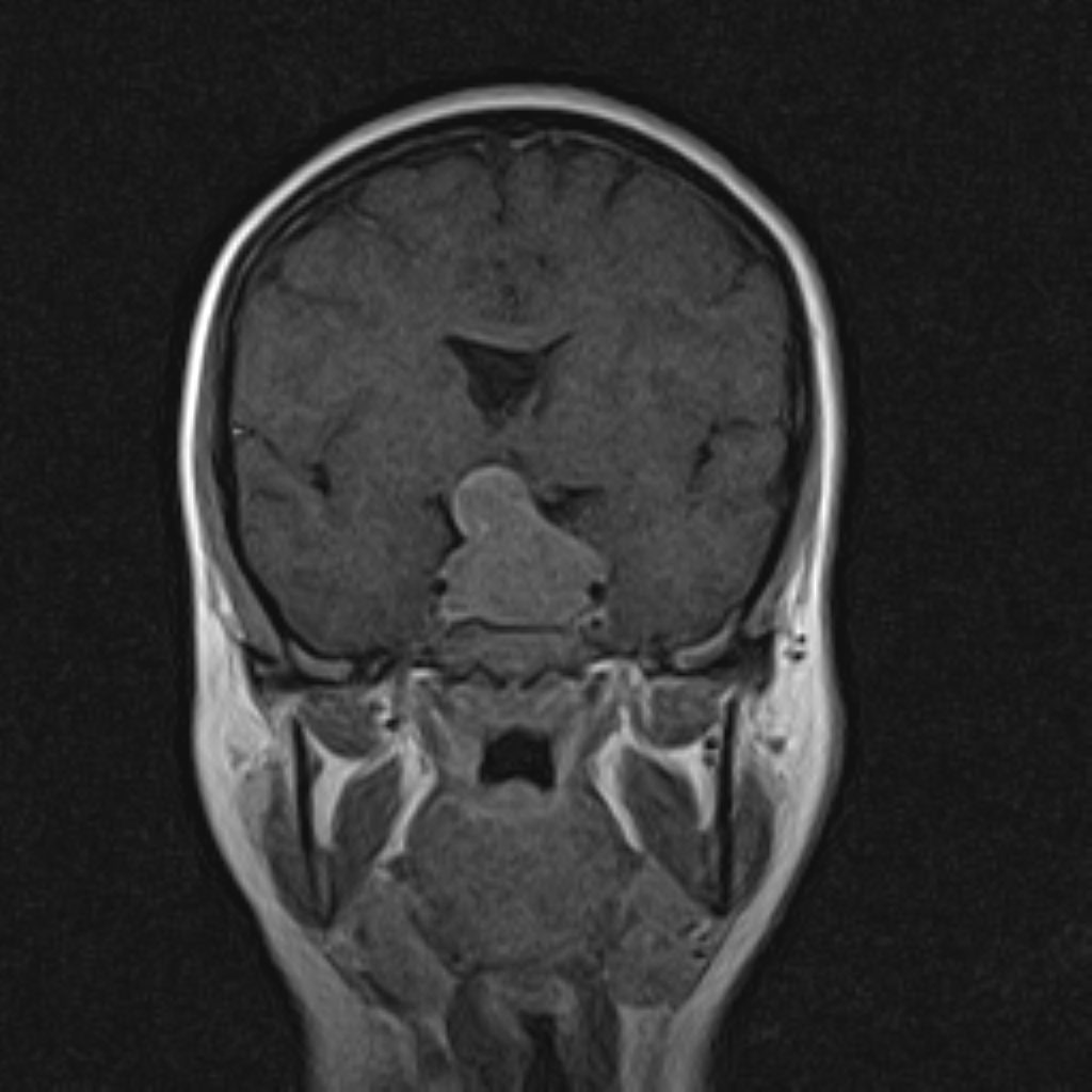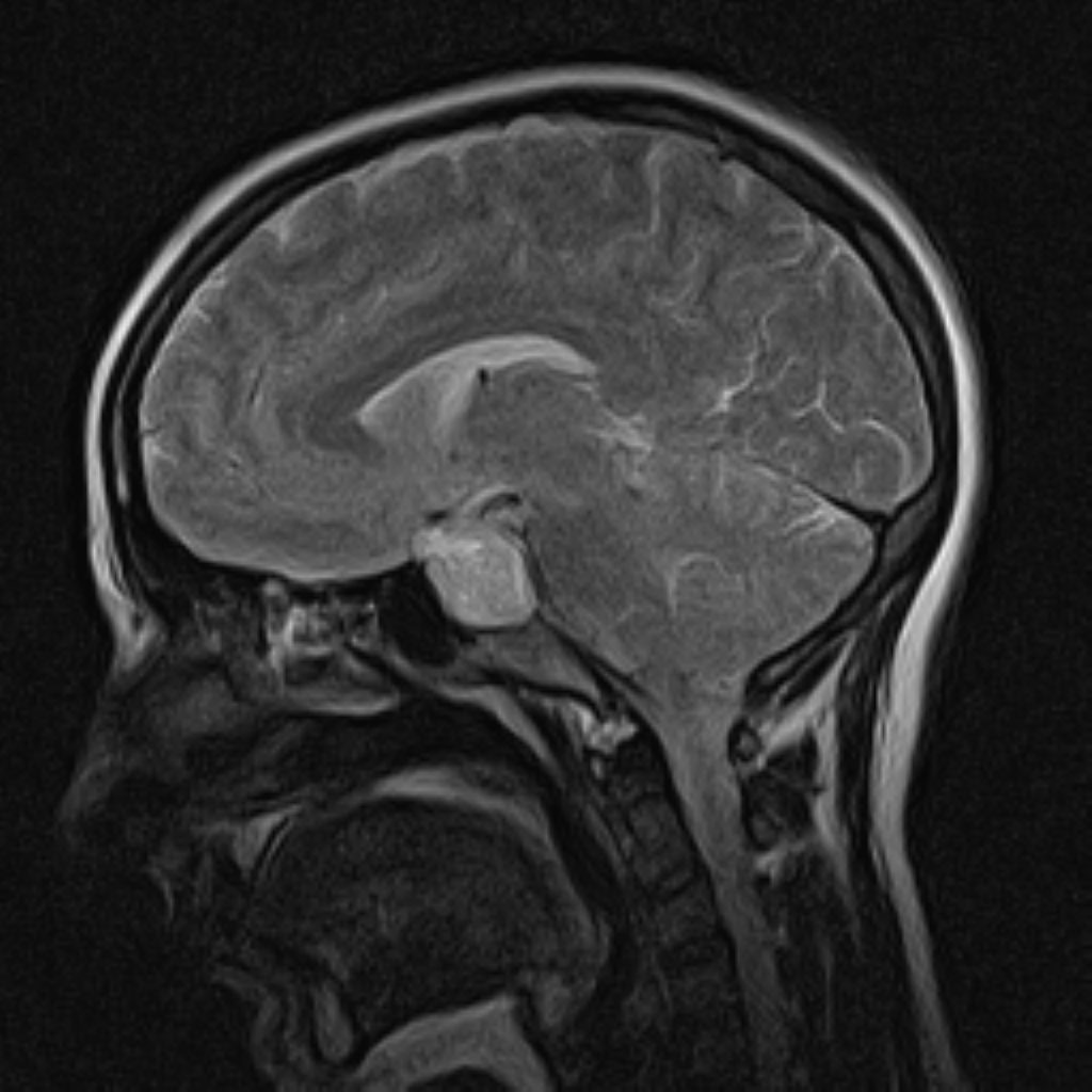 – A large extra axial – iso signal mass lesion ( 20 x 36 x 48 mm ) in pituitary fossa with extention to supra sella cistern & mass effect in chiasma optic with partial encasement of right & left ICA with pituitary expansion & with post contrast homogeneous enhancement suggestive for pituitary macro adenoma ( snow man disease )