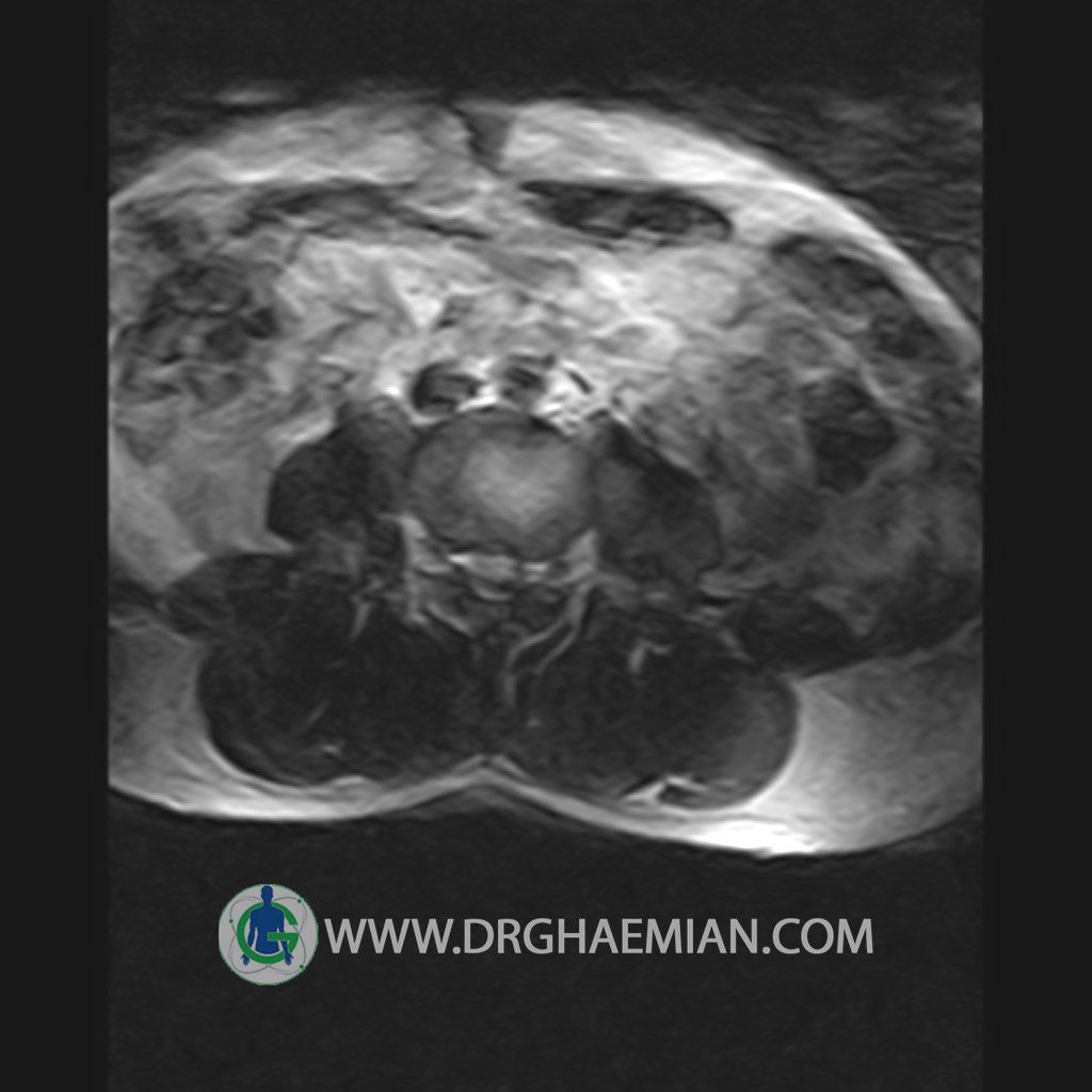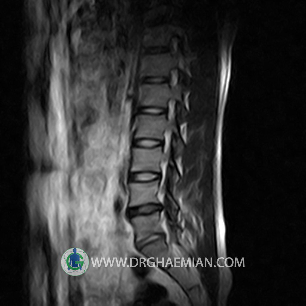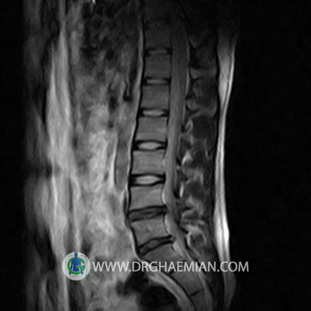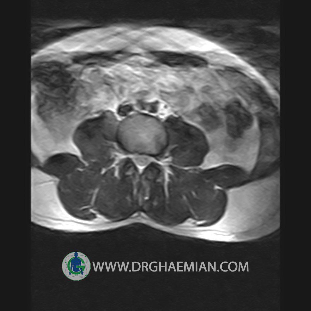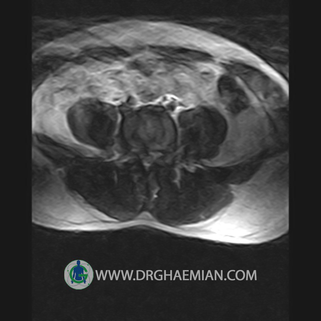 ام آر آی کمر از طریق انرژی آهنربا های قوی تصاویری از قسمت پایین ستون فقرات ( گودی کمر) ایجاد می کند. این نوع تصویربرداری از اشعه ایکس استفاده نمی کند. در این کیس تنگی دیسک کمر در دیسک L5/S1 و دهیدراتاسیون در دیسک L4/L5 دیده می شود.
