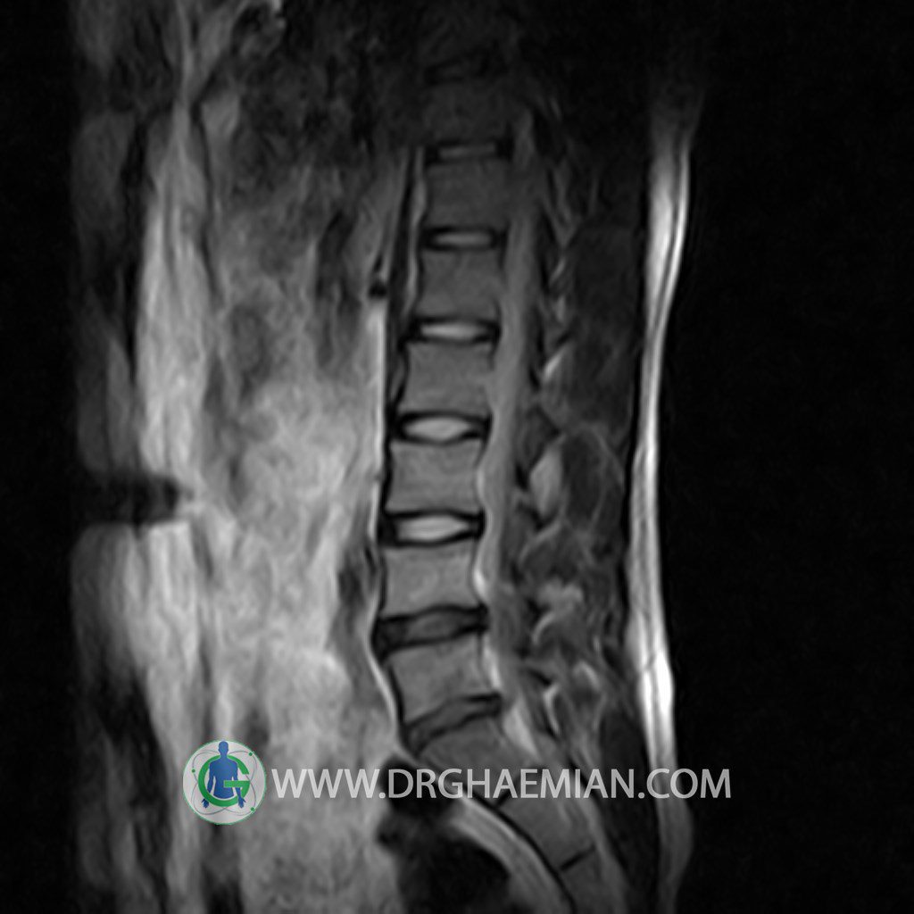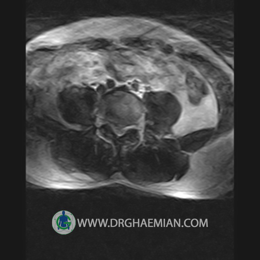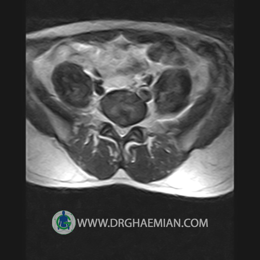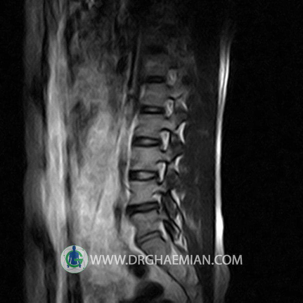 ام آر آی کمر از طریق انرژی آهنربا های قوی تصاویری از قسمت پایین ستون فقرات ( گودی کمر) ایجاد می کند. این نوع تصویربرداری از اشعه ایکس استفاده نمی کند. در این کیس تنگی دیسک کمر در دیسک L5/S1 و دهیدراتاسیون در دیسک L4/L5 دیده می شود.