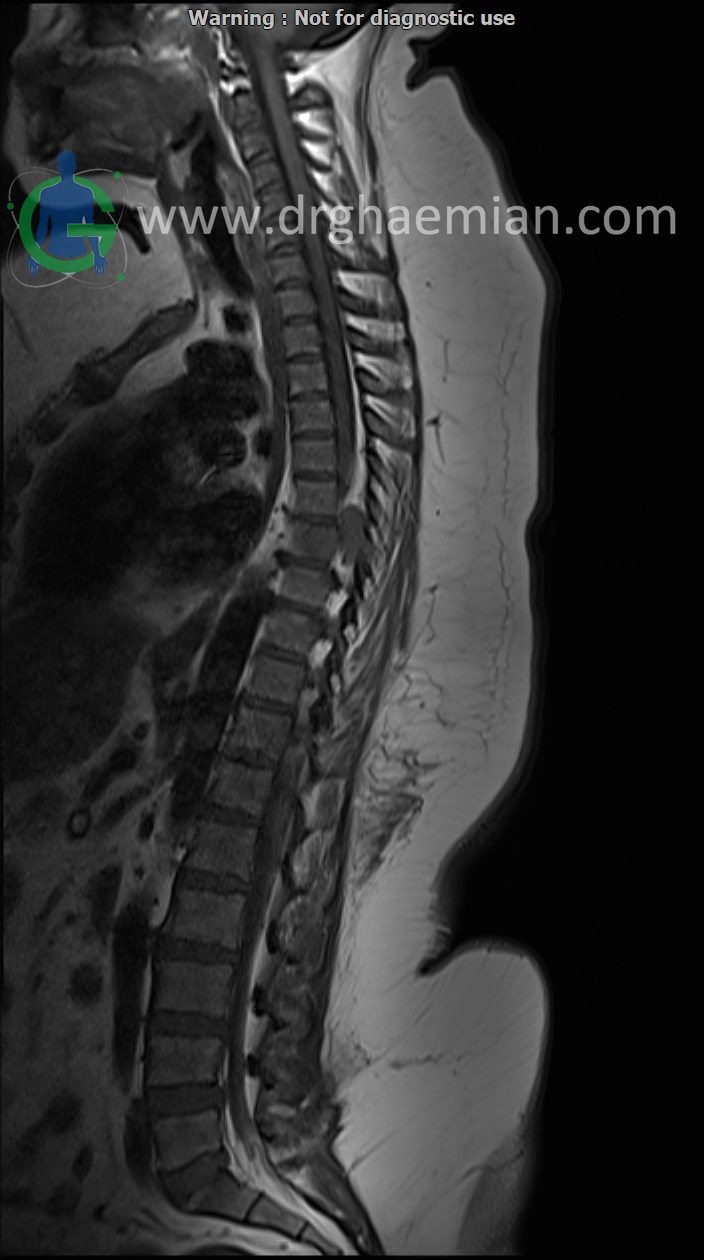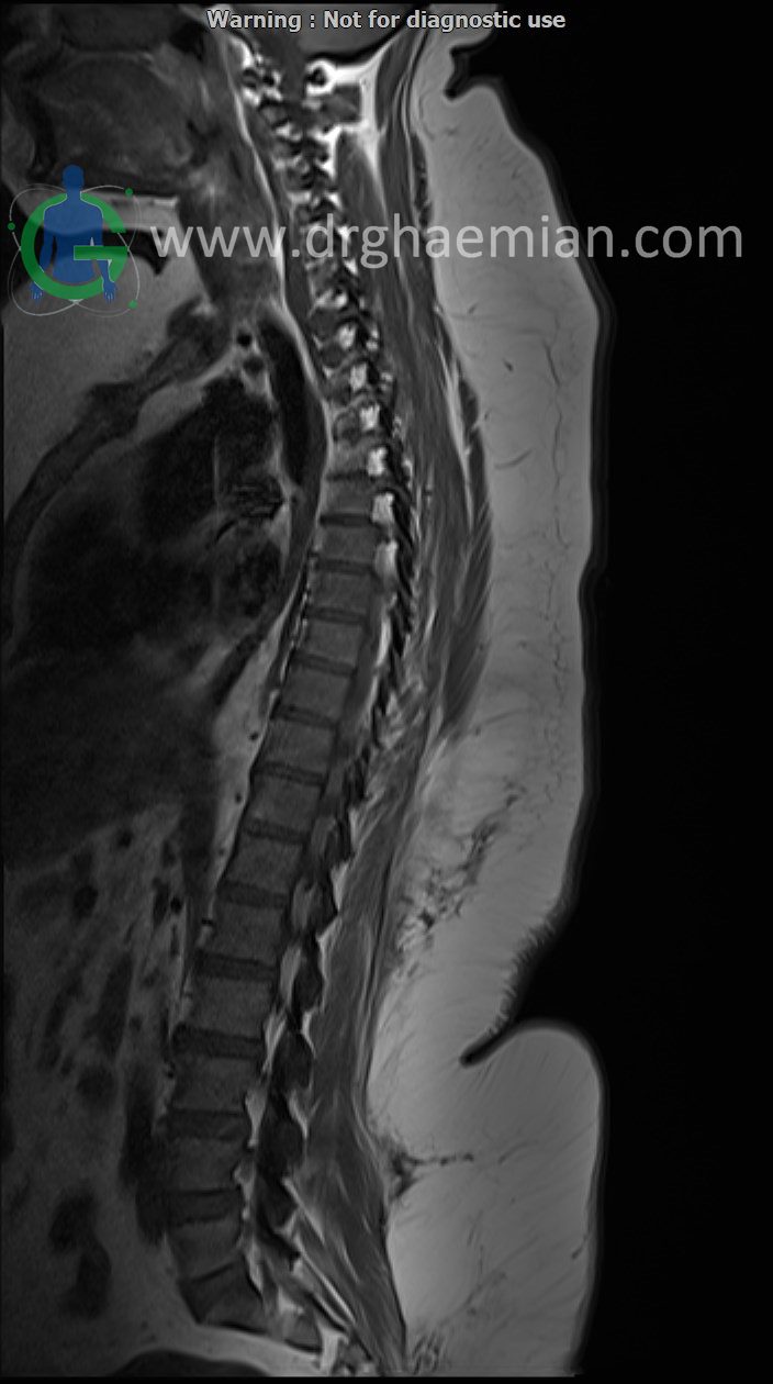 The thoracic spine shows a smooth kyphotic curvature with normal alignment. The vertebral bodies and endplates are normal in shape and signal intensity. The intervertebral disk spaces are normal height . The bony spinal canal has normal width. The imaged soft tissues show no abnormalities . Paravertebral stripe is normal in shape and signal intensity .