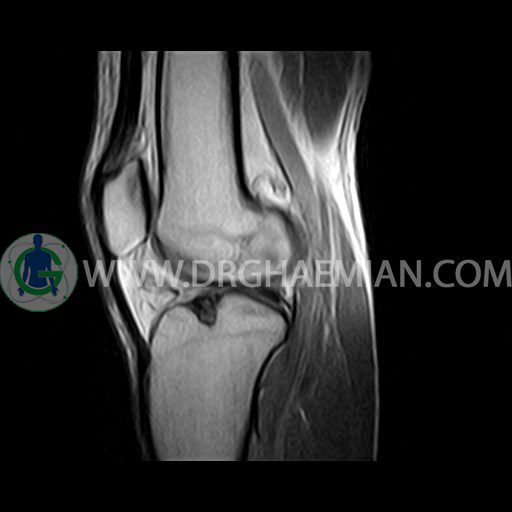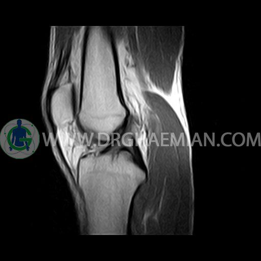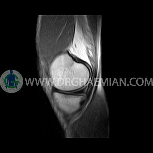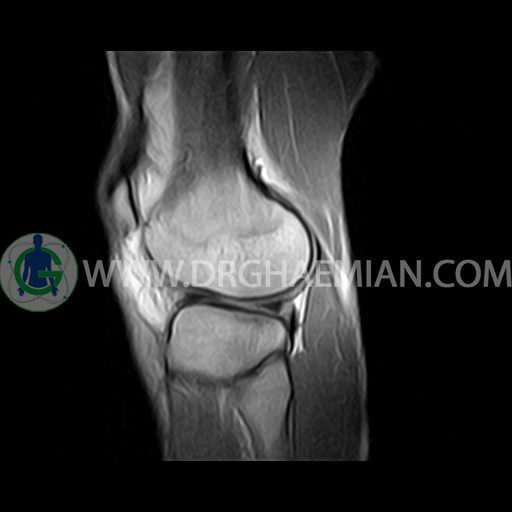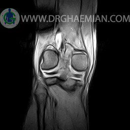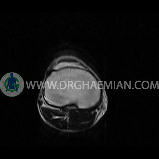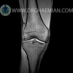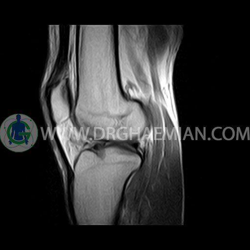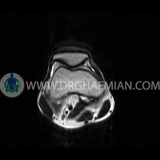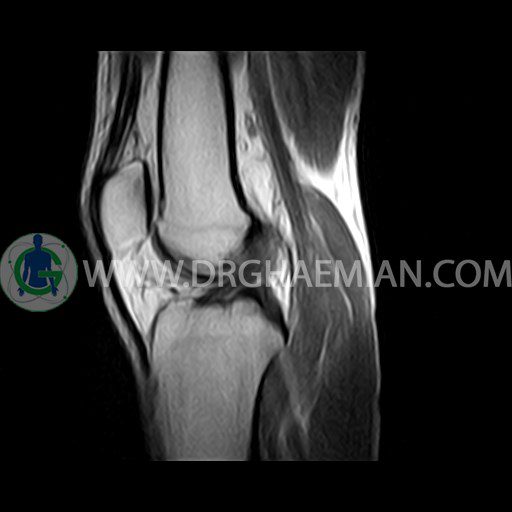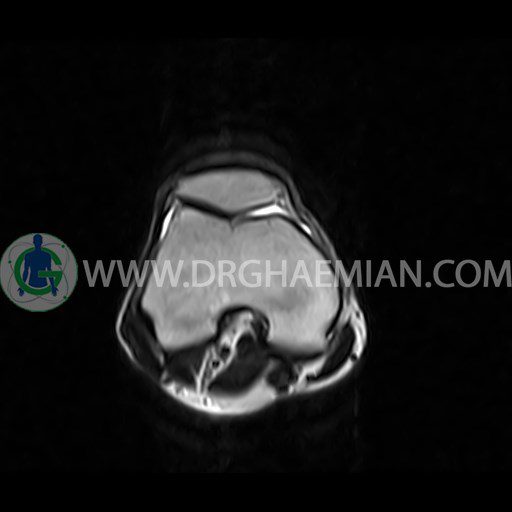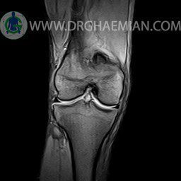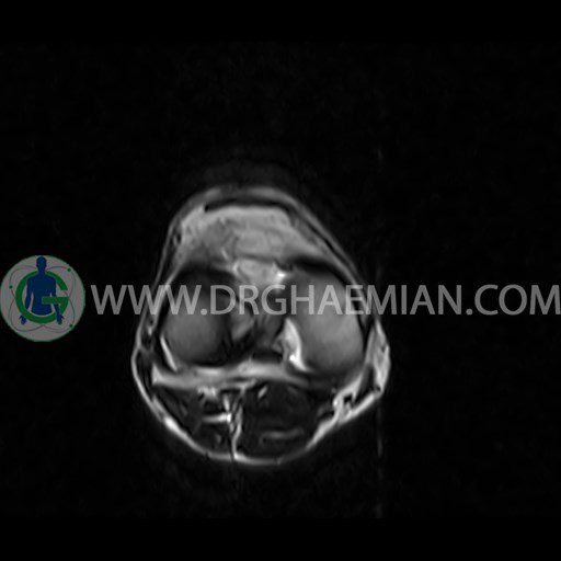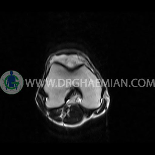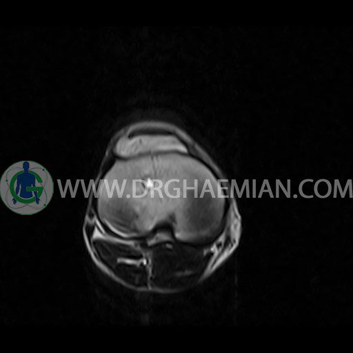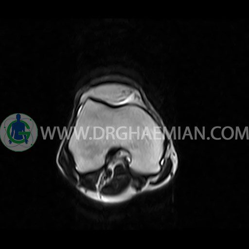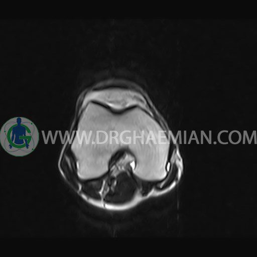 ام آر آی زانو با استفاده از آهنرباهای قوی تصاویری از مفصل، عضلات و بافت های زانو ایجاد می کند. این نوع تصویربرداری از تشعشعات استفاده نمی کند. در این کیس ضایعه استئوکندرال زانو و افیوژن ملایم همراه با تورم نسج نرم اطراف زانو دیده می شود.