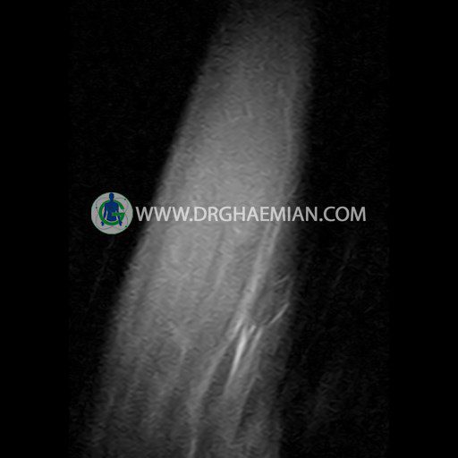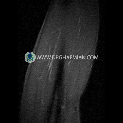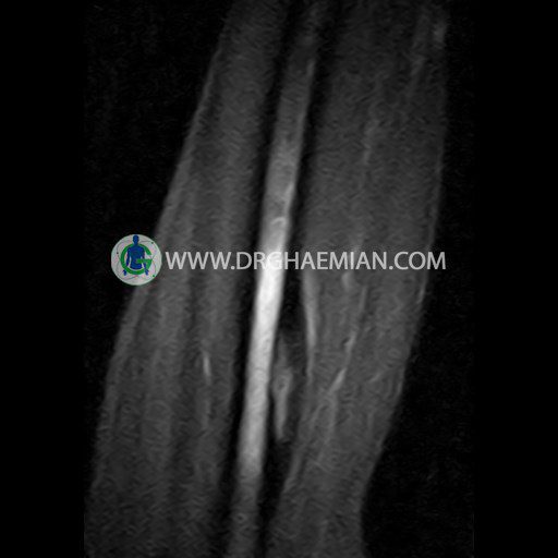 ام ار آی بازو با استفاده از میدان مغناطیسی، امواج رادیویی و کامپیوتری هوشمند تصاویر (اسلایس هایی) با جزییات از قسمت های مختلف دست شما مانند: بازو، آرنج، ساعد، مچ، دست و انگشتان و همچنین از بافت های مختلف مانند: غضروف، رباط ها، تاندون ها یا منیسک (ضربه گیر های عضلات) ایجاد می کند. در این کیس ضایعه استخوانی بازو بیمار مشاهده می شود که می تواند: روند التهابی مزمن یا استئوبلاستوم و استئومای استخوانی باشد.
