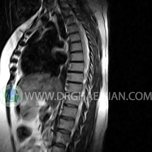 سی تی اسکن توراسیک یک روش تصویربرداری است که با استفاده از تشعشعات تصاویر عرضی مقطعی از ناحیه توراسیک ستون فقرات و بالا تنه ایجاد می کند. در این کیس ضایعه کیستیک پاراورتبرال، اسپوندیلوز، باریک شدن فضای دیسک، دیهیدراته و بیرون زدگی میان توراسیک دیده می شود.