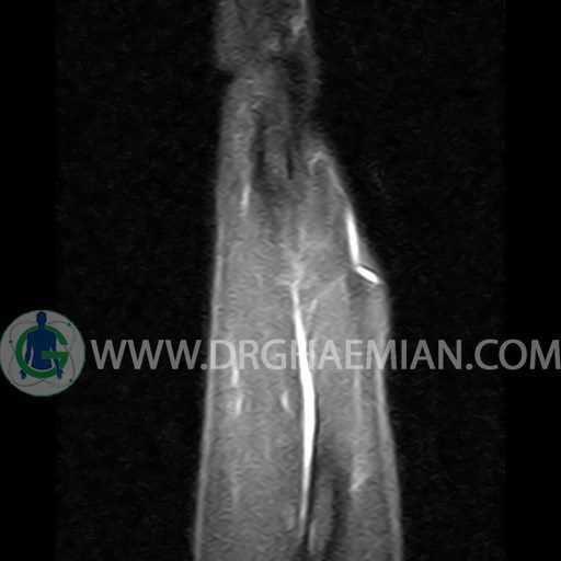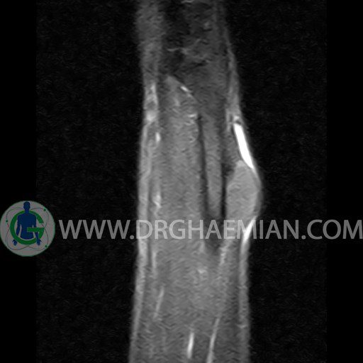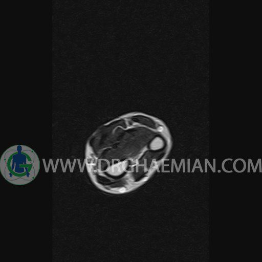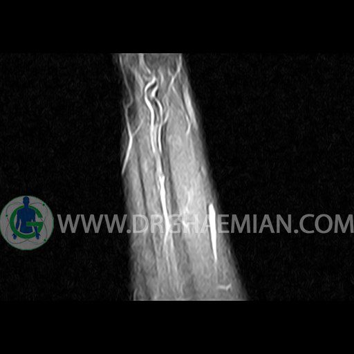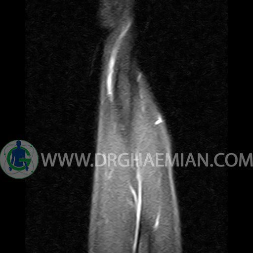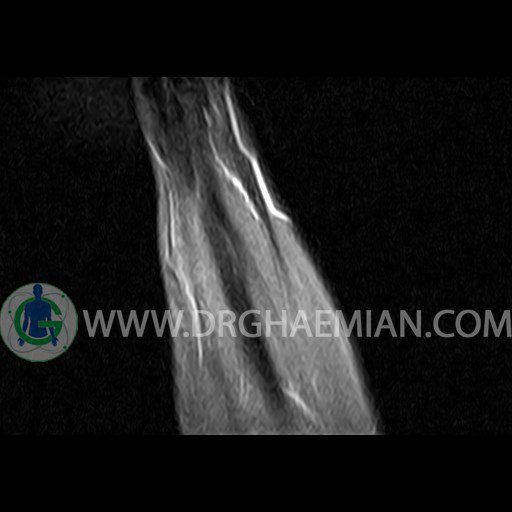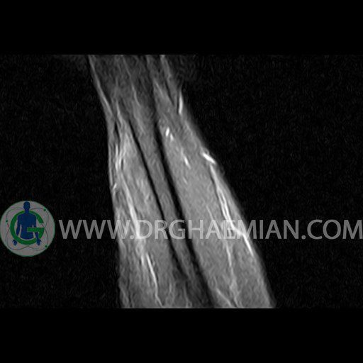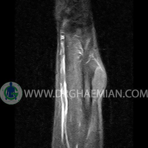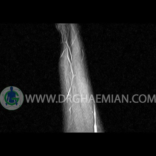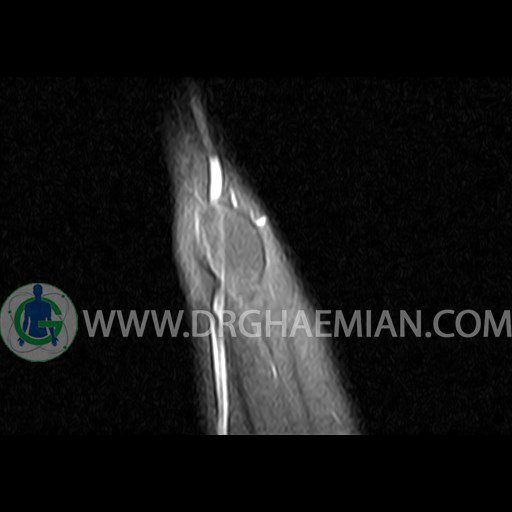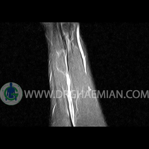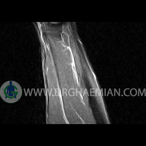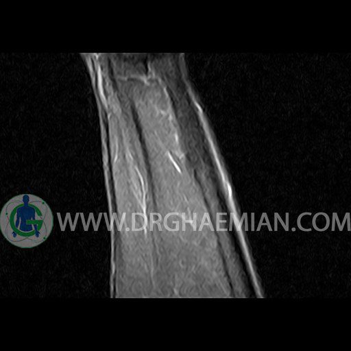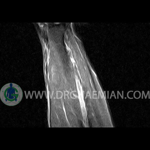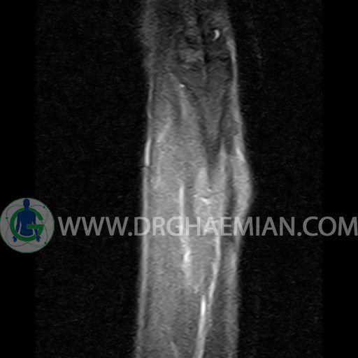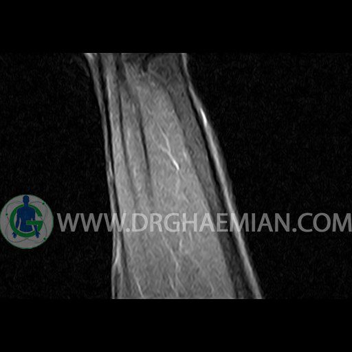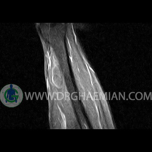 ام ار آی بازو با استفاده از میدان مغناطیسی، امواج رادیویی و کامپیوتری هوشمند تصاویر (اسلایس هایی) با جزییات از قسمت های مختلف دست شما مانند: بازو، آرنج، ساعد، مچ، دست و انگشتان و همچنین از بافت های مختلف مانند: غضروف، رباط ها، تاندون ها یا منیسک (ضربه گیر های عضلات) ایجاد می کند. در این کیس لیپوم داخل عضلانی ساعد بیمار دیده می شود.