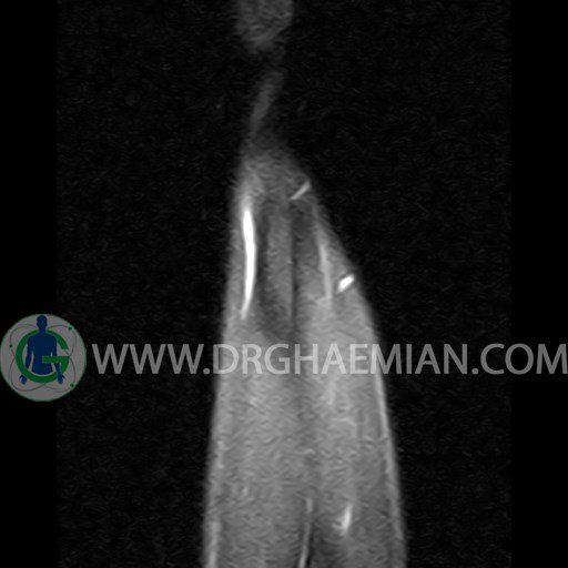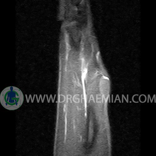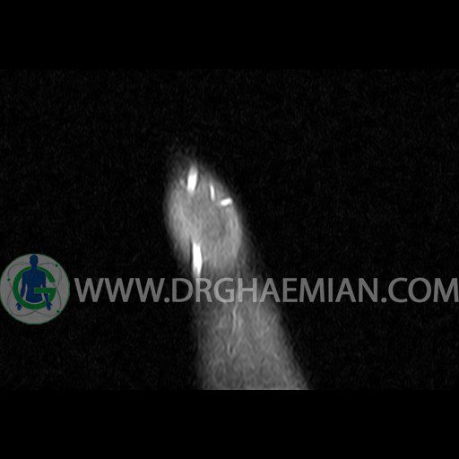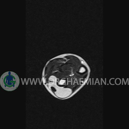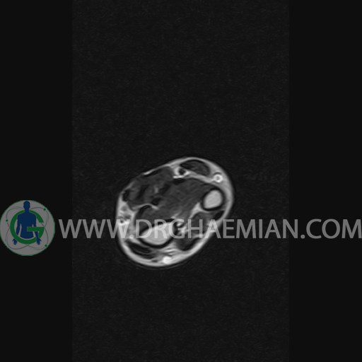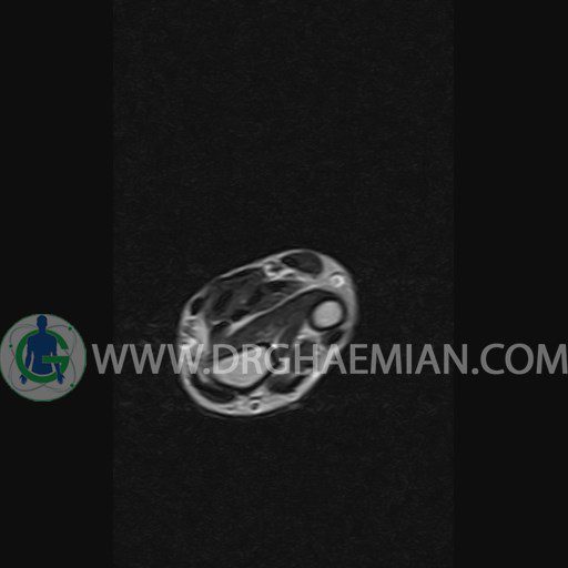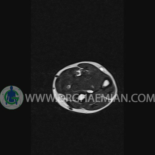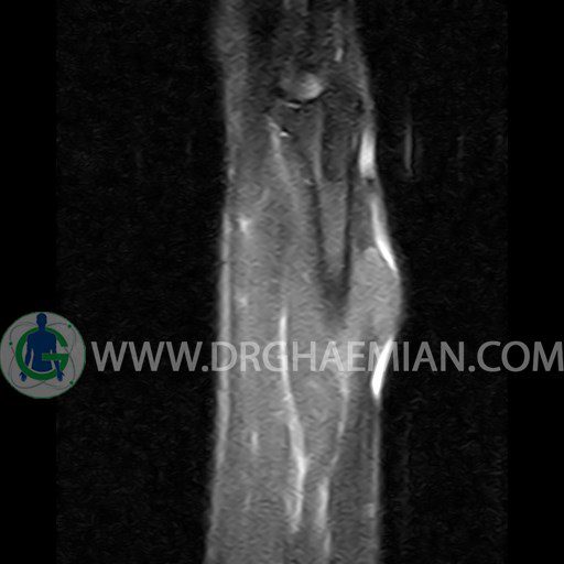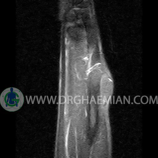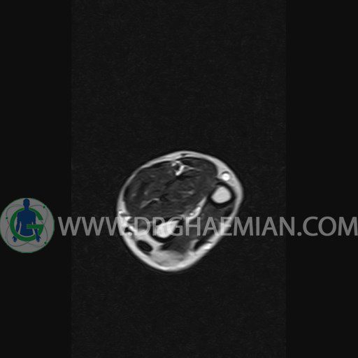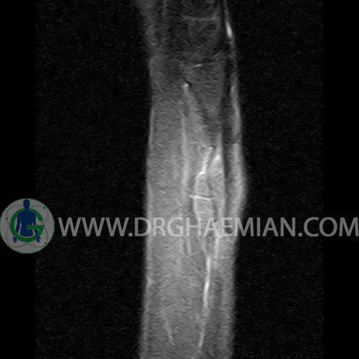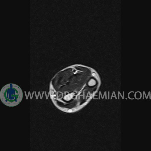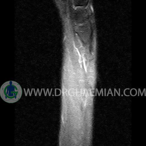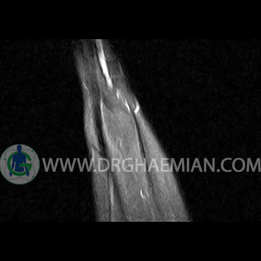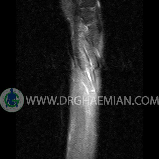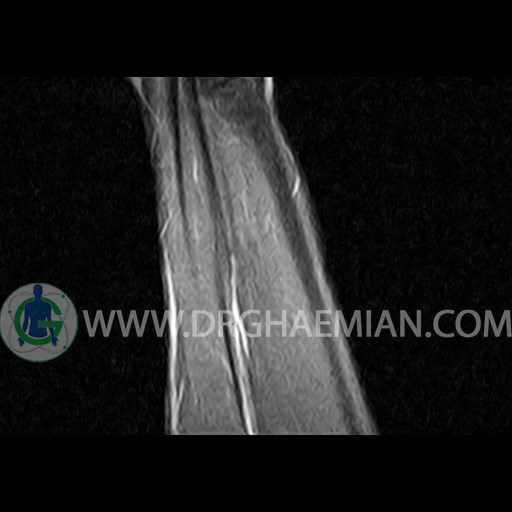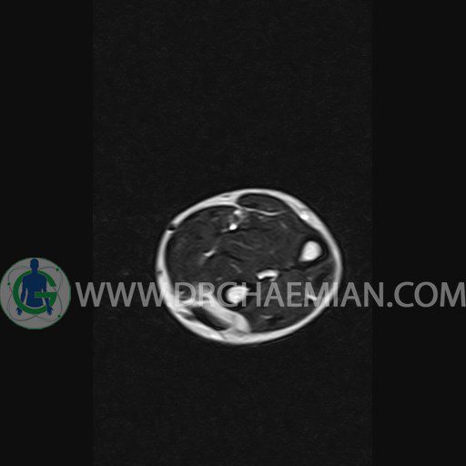ام ار آی بازو با استفاده از میدان مغناطیسی، امواج رادیویی و کامپیوتری هوشمند تصاویر (اسلایس هایی) با جزییات از قسمت های مختلف دست شما مانند: بازو، آرنج، ساعد، مچ، دست و انگشتان و همچنین از بافت های مختلف مانند: غضروف، رباط ها، تاندون ها یا منیسک (ضربه گیر های عضلات) ایجاد می کند. در این کیس لیپوم داخل عضلانی ساعد بیمار دیده می شود.