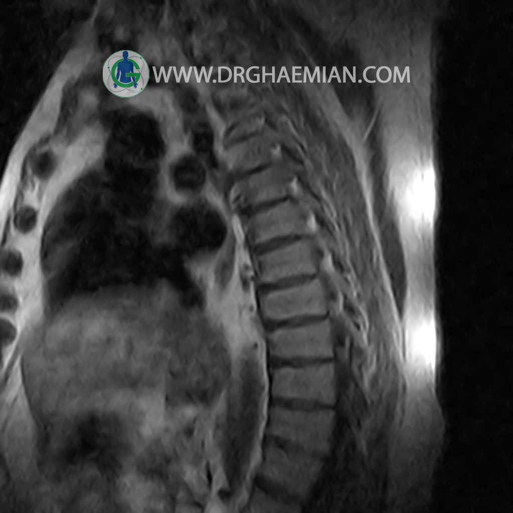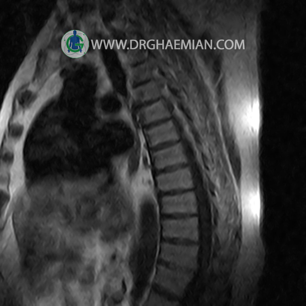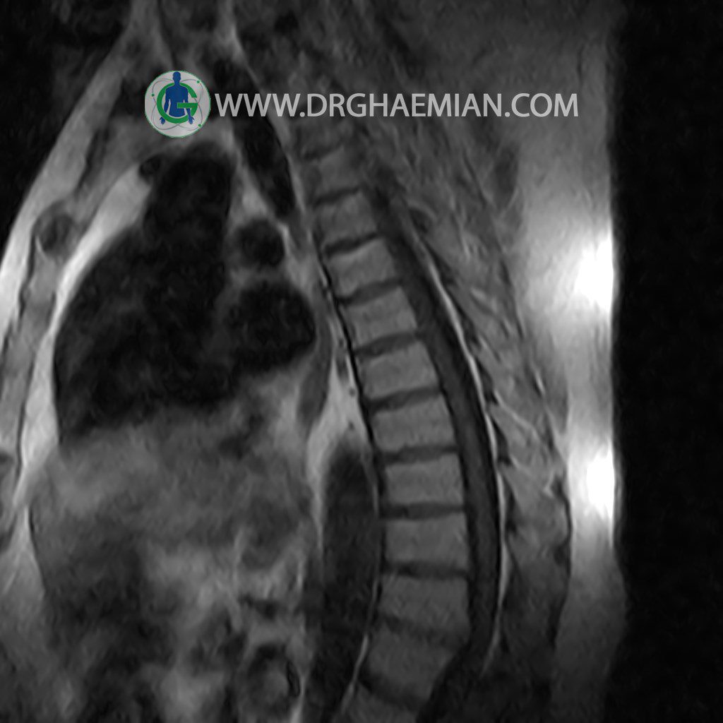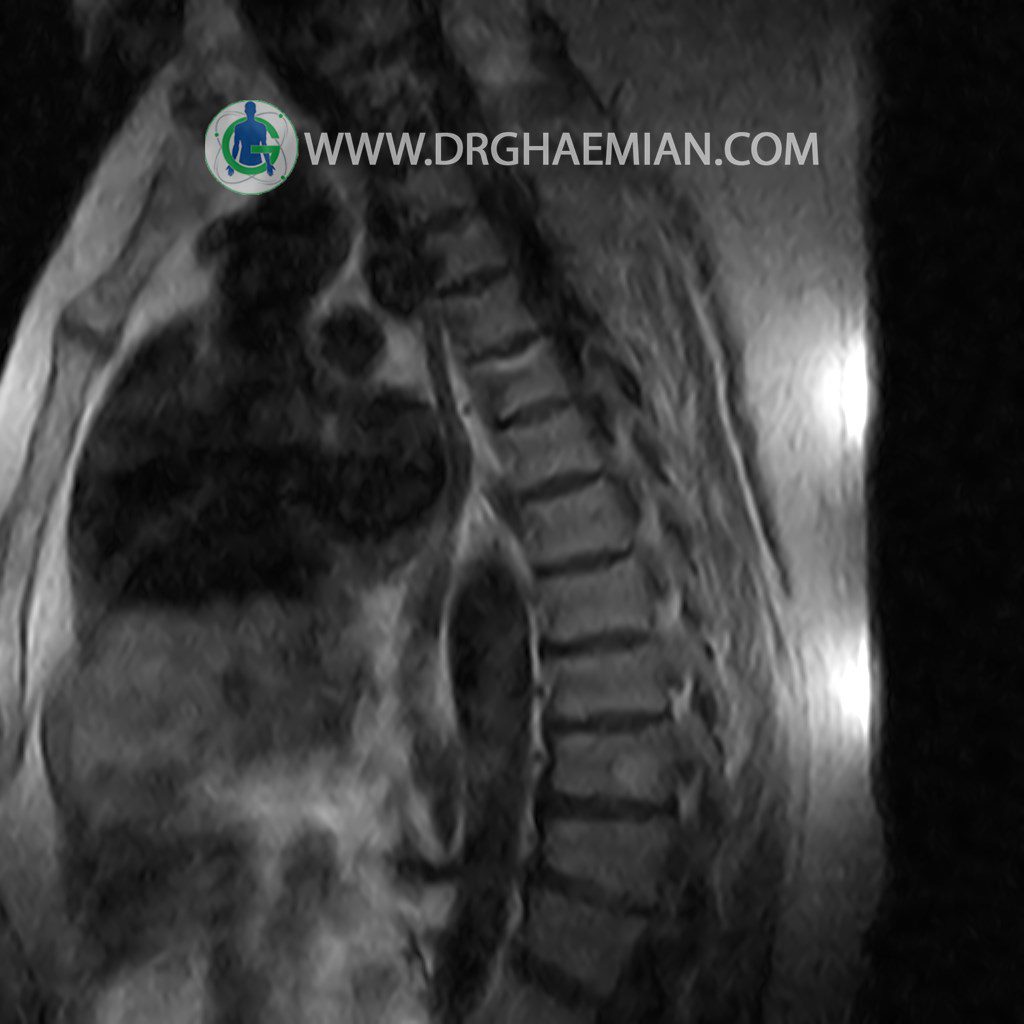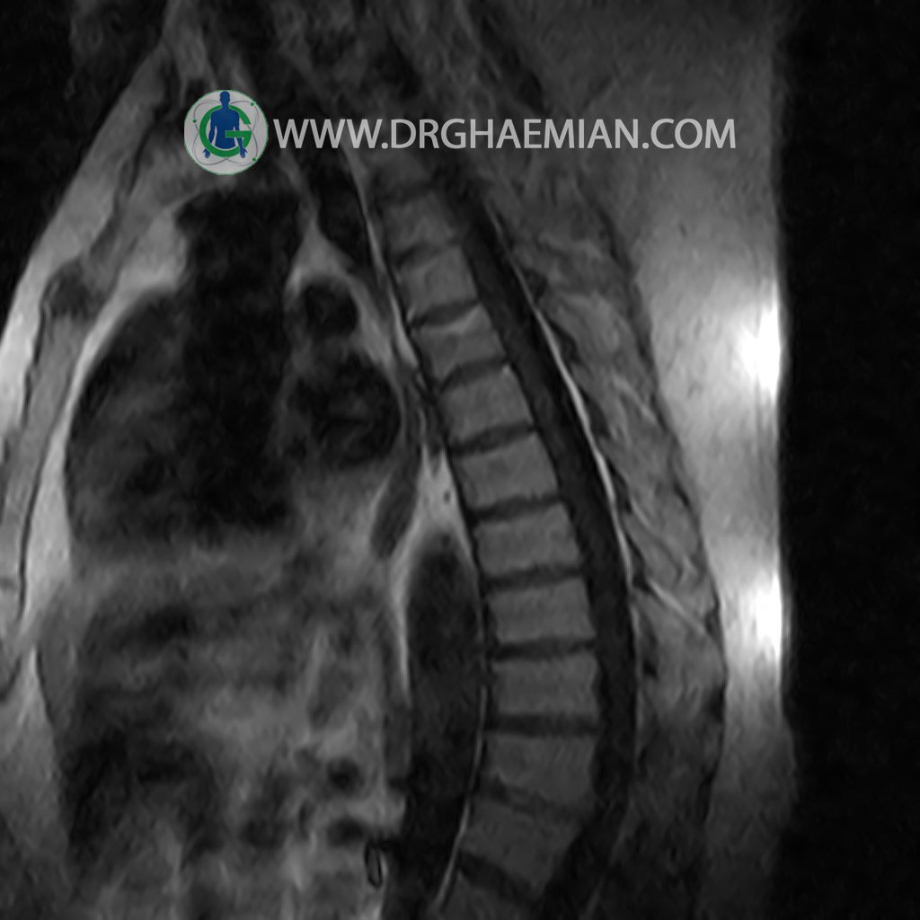 پزشکان اغلب از تصویربرداری ام آر آی برای تشخیص و درمان عارضه های پزشکی که فقط با استفاده از اشعه ایکس یا میدان مغناطیسی و امواج رادیویی قابل مشاهده است، استفاده می کنند. دستگاه ام آر آی تصاویر دقیق از ساختار های داخلی بدن ایجاد می کند. در این کیس مهره انتقالی در مهره L5/S1 به همراه هیپرکیفوز و اسپوندیلوز توراسیک و همانژیوم در مهره T10 و گره اشمرول در مهره L2 دیده می شود. علاوه بر آن تنگی مهره در مهره L3، اسپوندیلوز ، دیهادریته دیسک و بیرون زدگی در مهره ای T11/T12, L1/L2/L3, L4/L5 مشاهد شده.