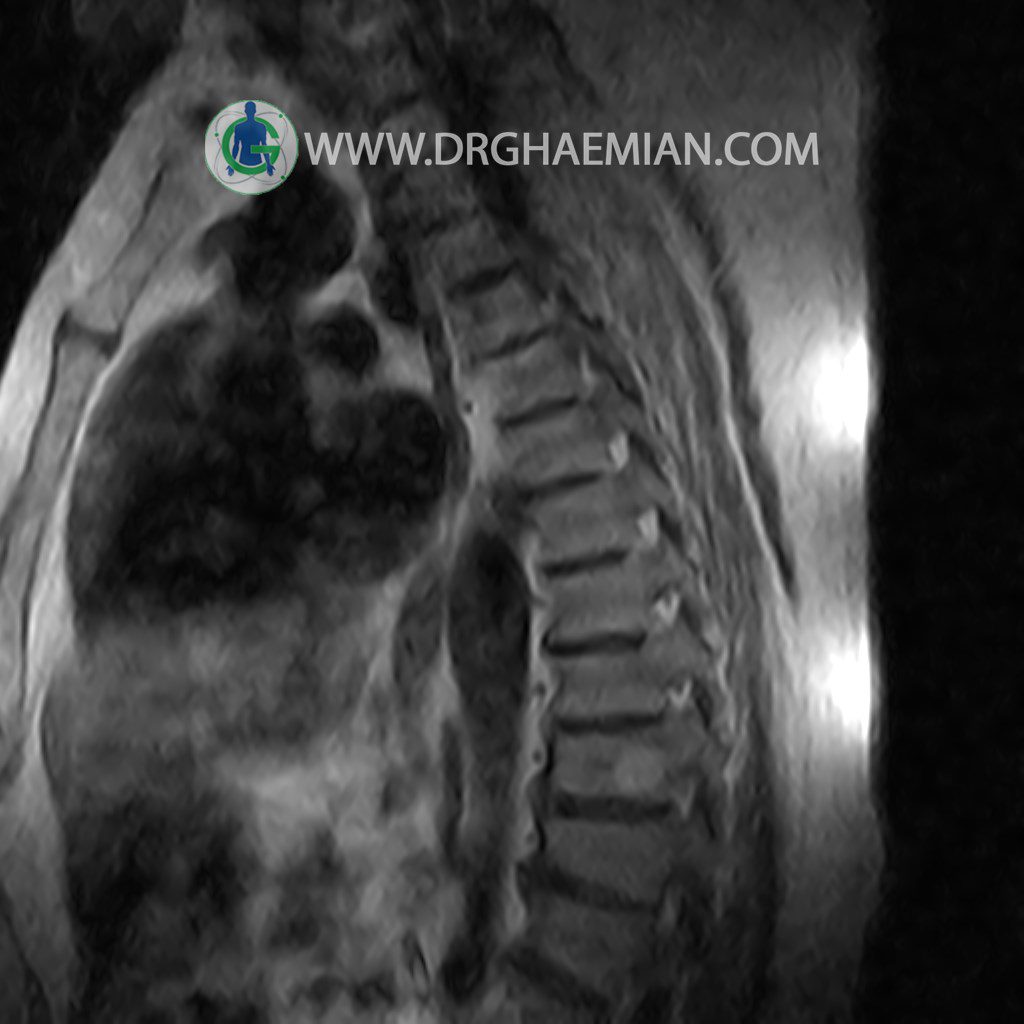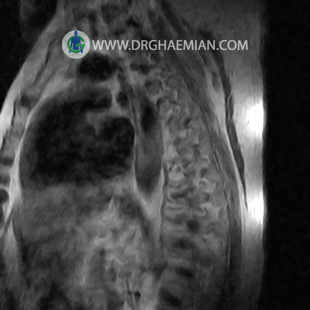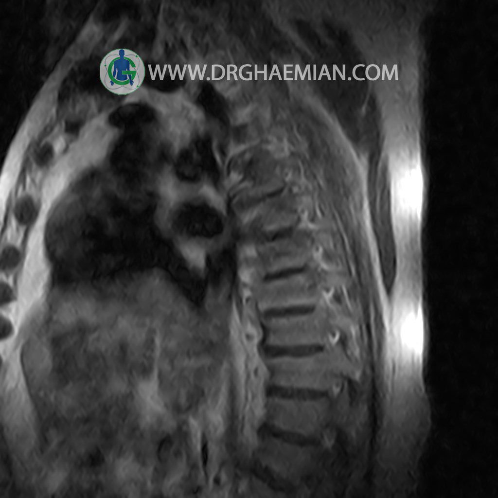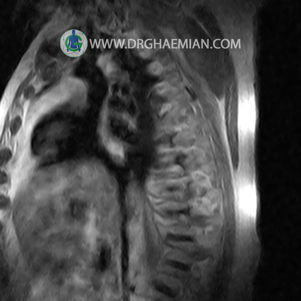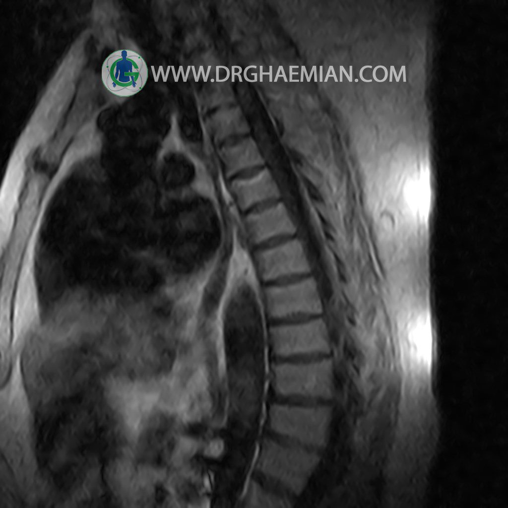 پزشکان اغلب از تصویربرداری ام آر آی برای تشخیص و درمان عارضه های پزشکی که فقط با استفاده از اشعه ایکس یا میدان مغناطیسی و امواج رادیویی قابل مشاهده است، استفاده می کنند. دستگاه ام آر آی تصاویر دقیق از ساختار های داخلی بدن ایجاد می کند. در این کیس مهره انتقالی در مهره L5/S1 به همراه هیپرکیفوز و اسپوندیلوز توراسیک و همانژیوم در مهره T10 و گره اشمرول در مهره L2 دیده می شود. علاوه بر آن تنگی مهره در مهره L3، اسپوندیلوز ، دیهادریته دیسک و بیرون زدگی در مهره ای T11/T12, L1/L2/L3, L4/L5 مشاهد شده.