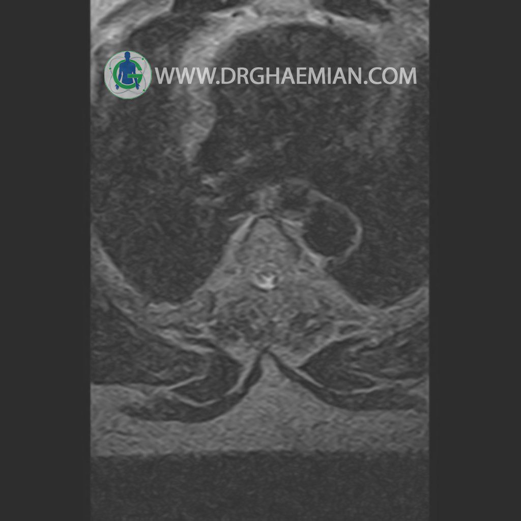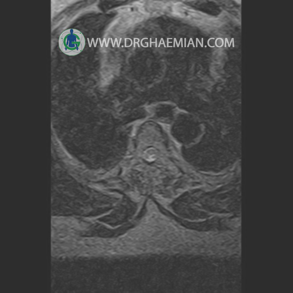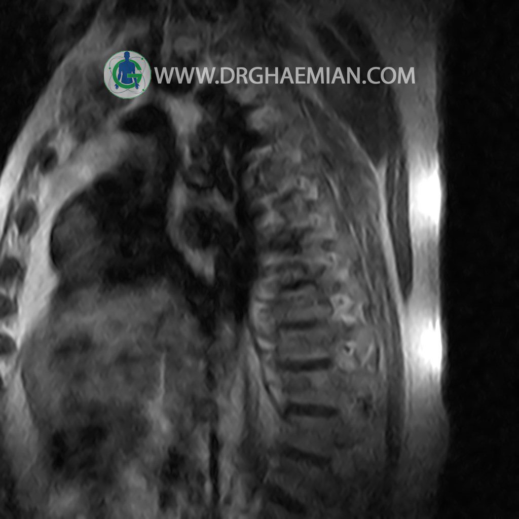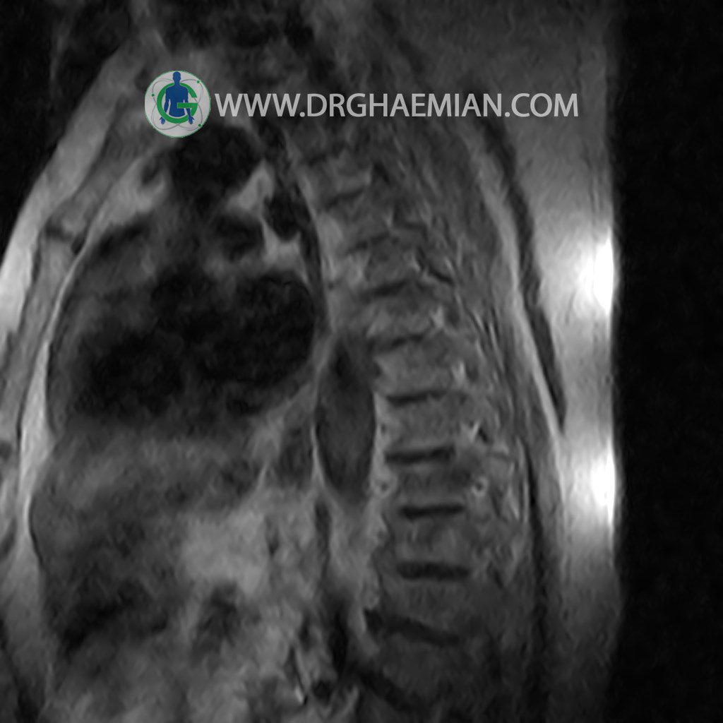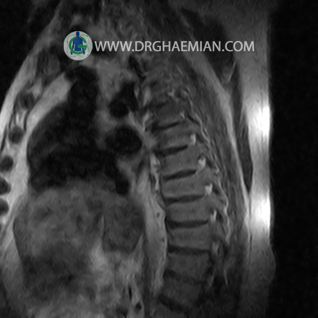 پزشکان اغلب از تصویربرداری ام آر آی برای تشخیص و درمان عارضه های پزشکی که فقط با استفاده از اشعه ایکس یا میدان مغناطیسی و امواج رادیویی قابل مشاهده است، استفاده می کنند. دستگاه ام آر آی تصاویر دقیق از ساختار های داخلی بدن ایجاد می کند. در این کیس مهره انتقالی در مهره L5/S1 به همراه هیپرکیفوز و اسپوندیلوز توراسیک و همانژیوم در مهره T10 و گره اشمرول در مهره L2 دیده می شود. علاوه بر آن تنگی مهره در مهره L3، اسپوندیلوز ، دیهادریته دیسک و بیرون زدگی در مهره ای T11/T12, L1/L2/L3, L4/L5 مشاهد شده.